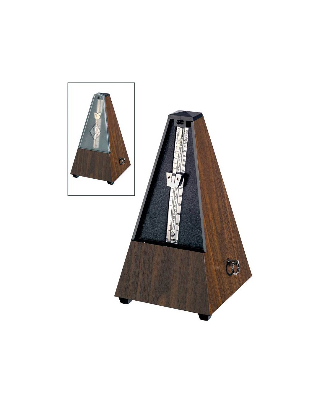 metronome, pyramid shaped, plastic casing, without bell, walnut grain