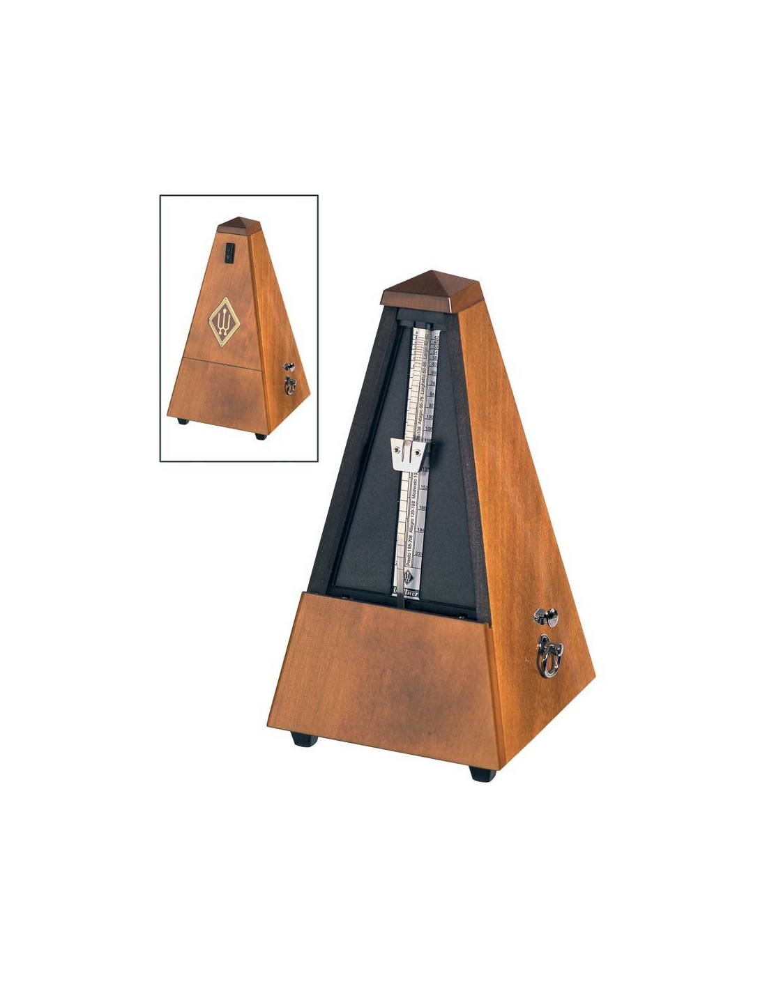 metronome, pyramid shaped, wooden casing, with bell, mat silk, walnut-colored