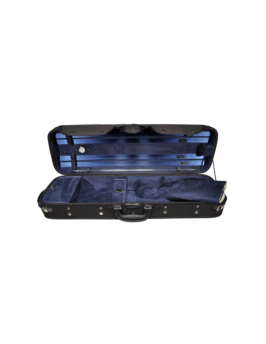 violin case 4/4, oblong, wood, 2 straps, black, blue suede fabric interior