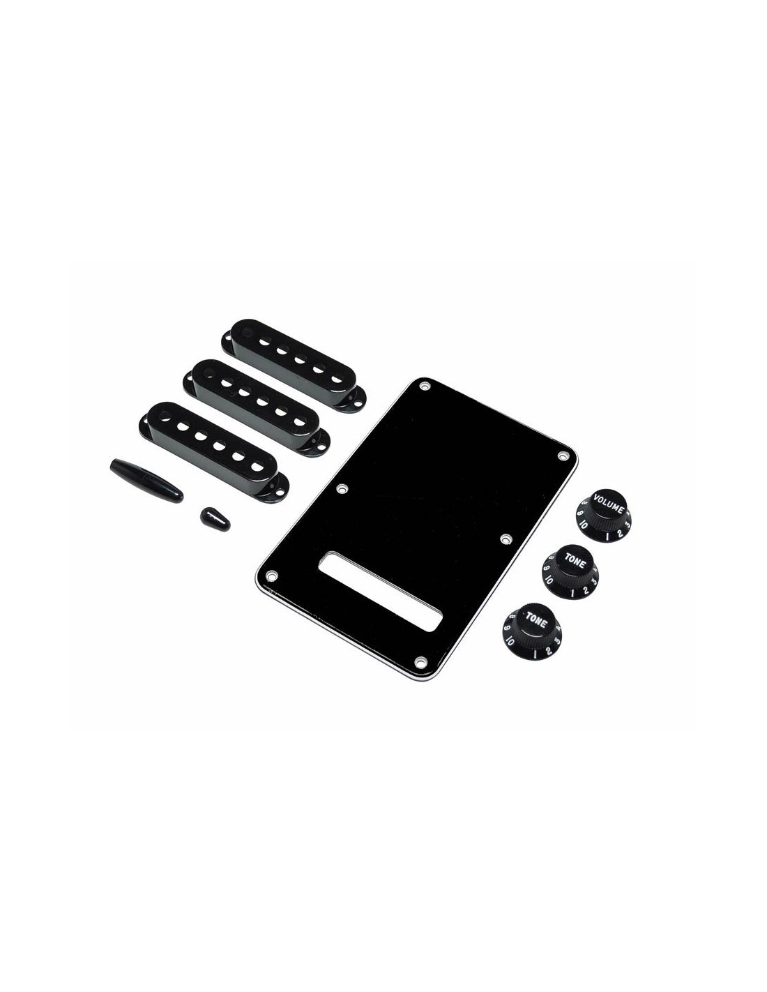strat accessory kit, contains pot knobs, switch tip, backplate, pickup covers, black