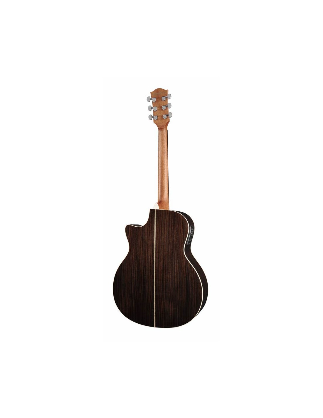 The technical and aesthetical advanced features include bone fittings, a double action trussrod, voluted headstock joint, cotton capped X-braces, mahogany back braces, high grade Derjung machine heads, USA D'Addario EXP16 coated phosphor bronze strings and Fishman electronics.
