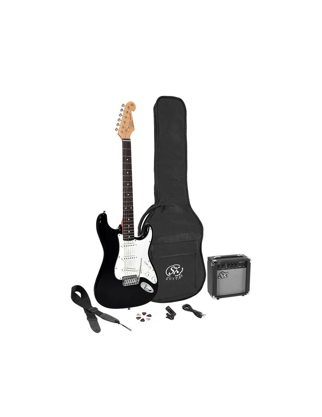 ST style electric guitar pack, 10W amp, bag, tuner, strap, cable & 6 picks, black