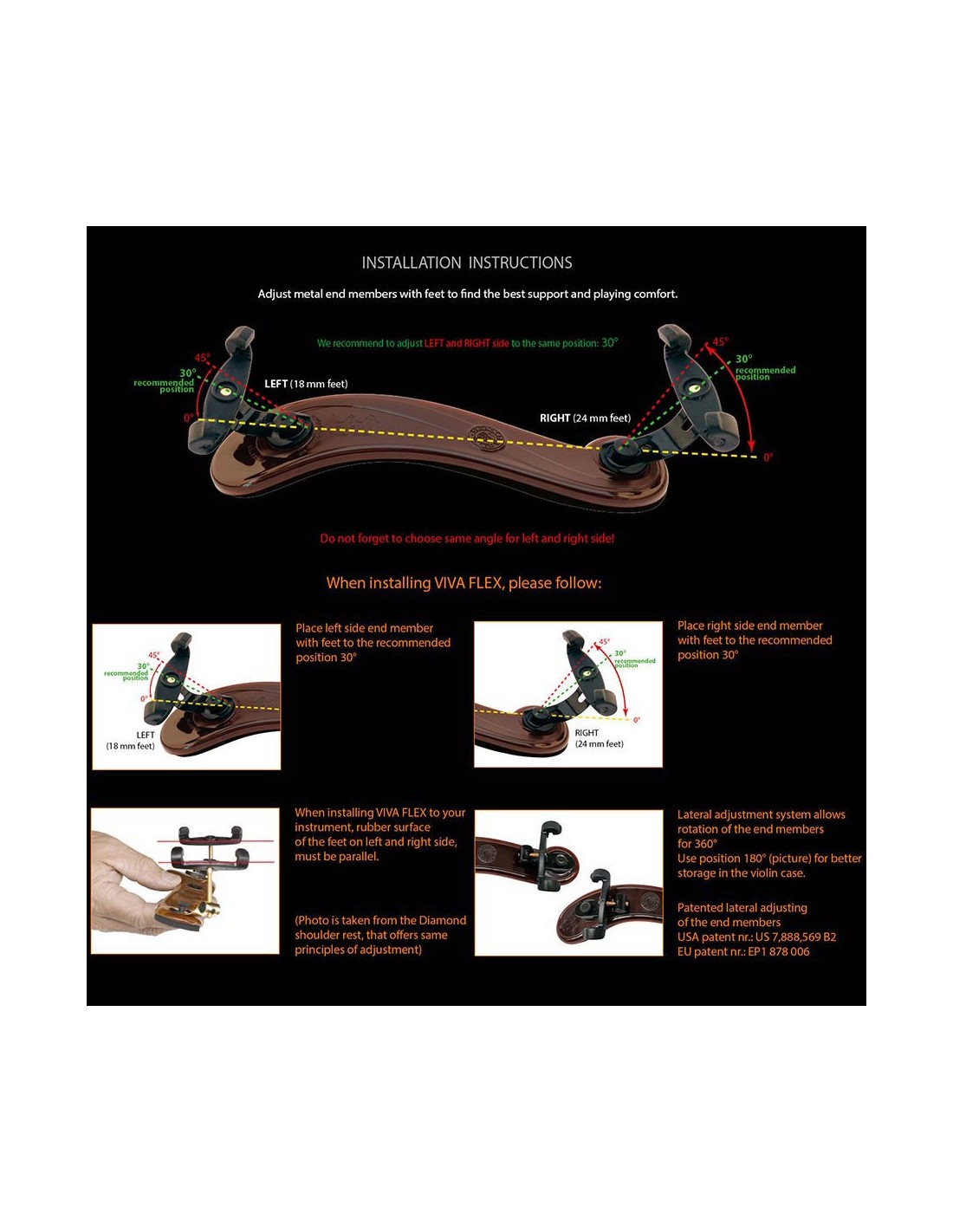 Viva flex - the best adjustable shoulder rest, specially designed for young violinists, sudents or professionals. Twisted base member form assures optimum comfort of playing. Patented lateral adjustment sistem, with flexible metal end members (same as on Diamond shoulder rest).