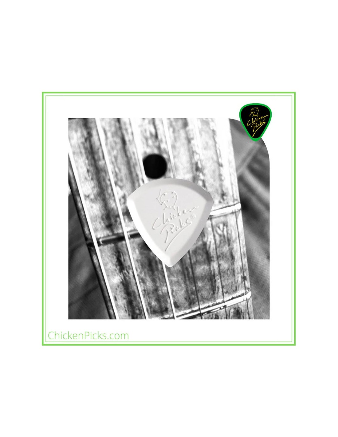 There is nothing finer or more reassuring than having your own special pick that one that you always reach for because it plays so good! ChickenPicks® are designed to be that go-to pick from the get-go. Though the material is extremely durable, it does wear just a little, and in just the right way. Thats why after a while, a ChickenPicks® comes to fit perfectly in your grip and in your musical style. This is a pick that will grow on you, and grow with you. The ChickenPicks® advantage is simply this: a hand-made, durable, and personal pick that brings a lot more of YOU and your character into the music you play. This is something that an average, thin, throw-away guitar pick can never offer.