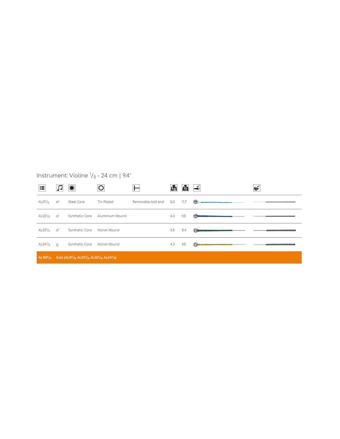 ALPHAYUE D- and G-strings in 3/4 to 1/16 are wrapped with Monel.