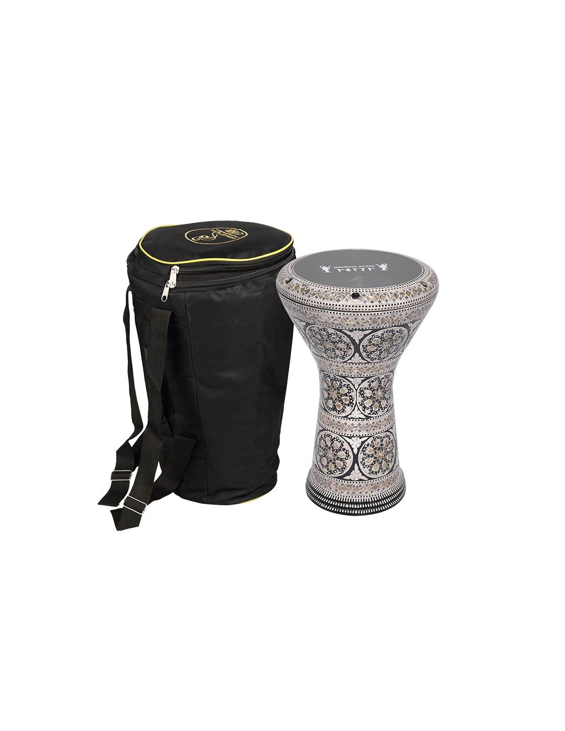 These Egyptian-style Goblet drums, also called Darbuka, is light in weight but has a full sound with a warm bass and clear sounding highs.- cast aluminum- hand inlaid- 22 cm diameter- 44 cm deep- with 6 lugs, cover and spare head
