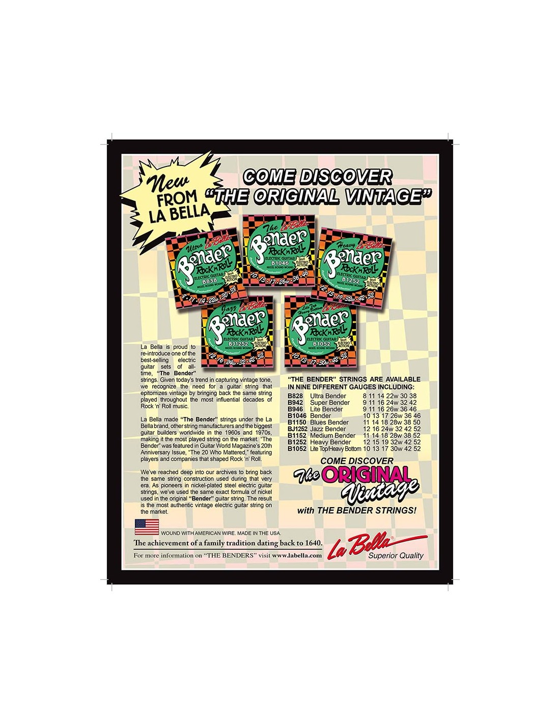 La Bella made The Bender strings under the La Bella brand, other string manufacturers and the biggest guitar builders worldwide in the 1960s and 1970s, making it the most played string on the market. The Bender was featured in Guitar World Magazines 20th Anniversary Issue, "The 20 Who Mattered," featuring players and companies that shaped Rock n' Roll.