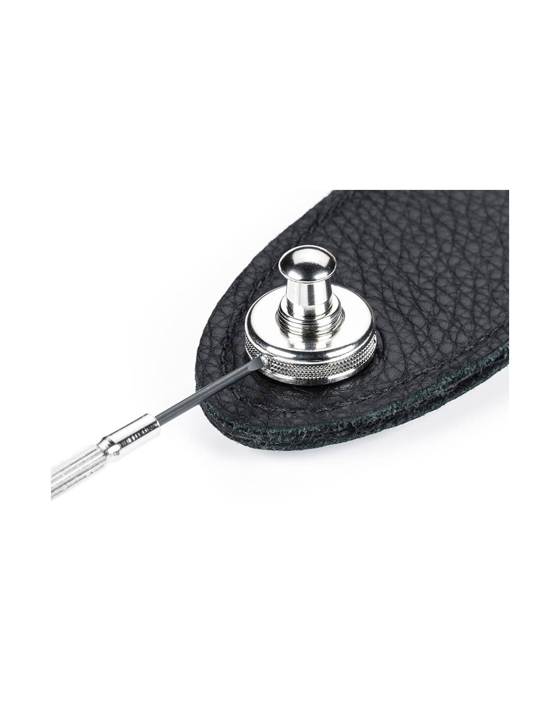 New and unique solid one-piece strap button in hardened steel with self-tapping wood thread. Simply screw it on with an Allen key (size 3 mm).