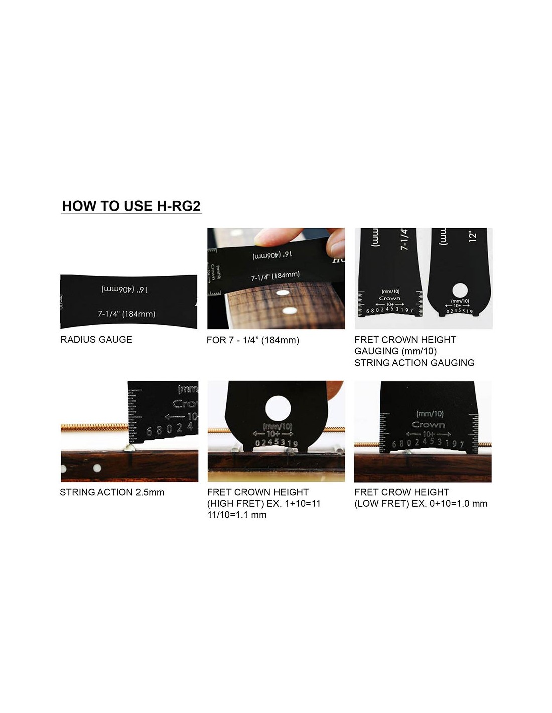 The Hosco original fingerboard gauge is a ruler shaped tool to determine the radius of your fingerboard. You can measure the 6 most common fingerboard radii: 7,25" , 9,5", 10", 12", 14", 16".