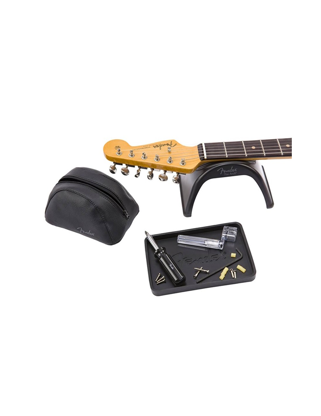Patented design offers the convenience and portability to work on your guitar anywhere Arch neck rest made of TPE rubber safe for nitro finishes; non-slip TPE rubber feet TPE rubber base doubles as a guitar body rest or to hold loose parts Faux leather pouch can hold your essential tools