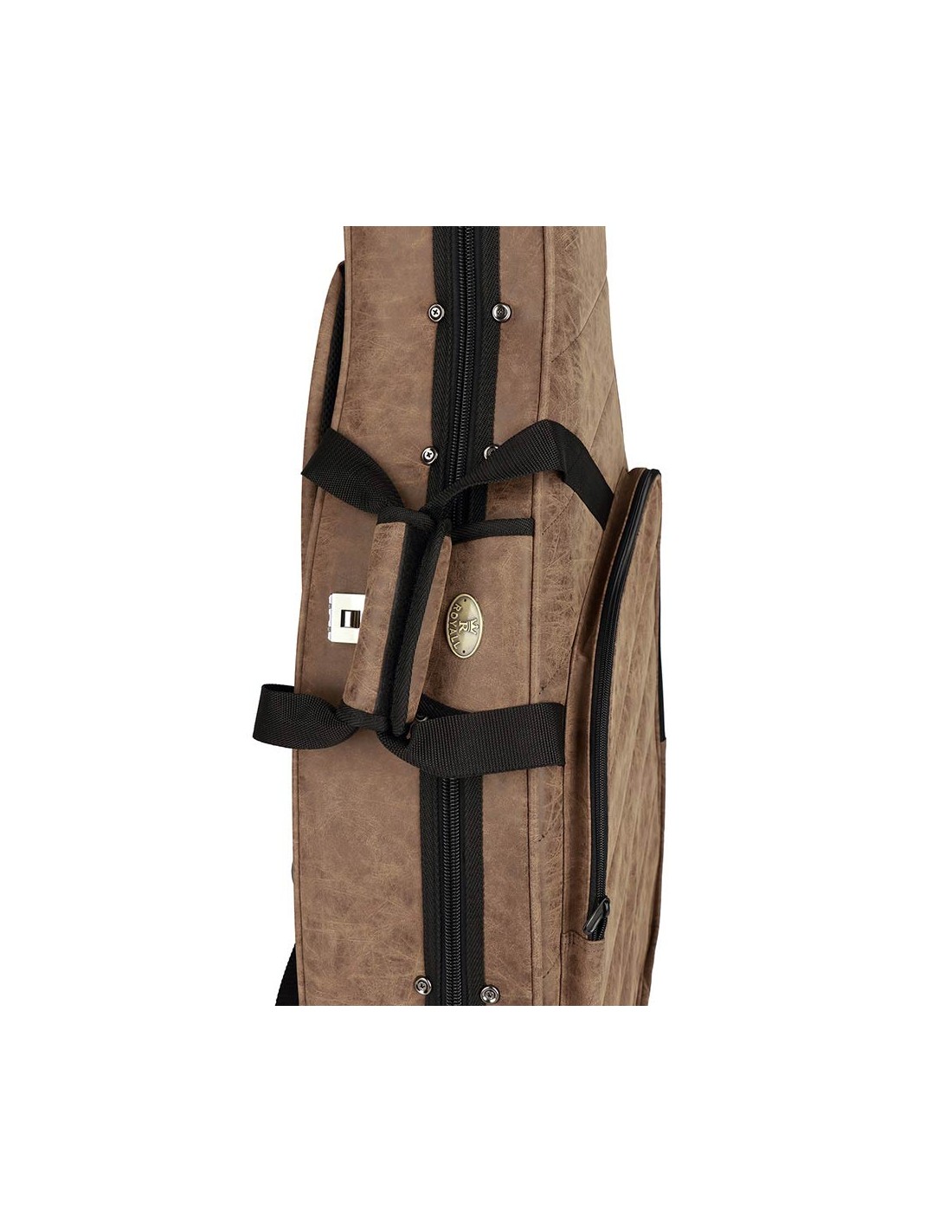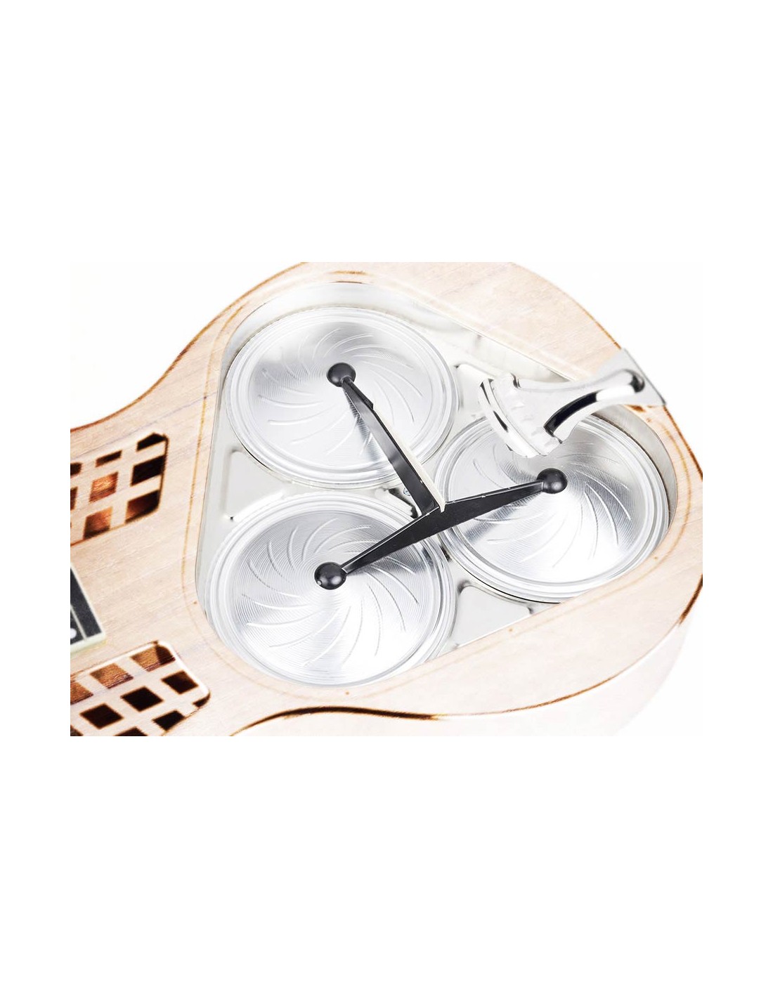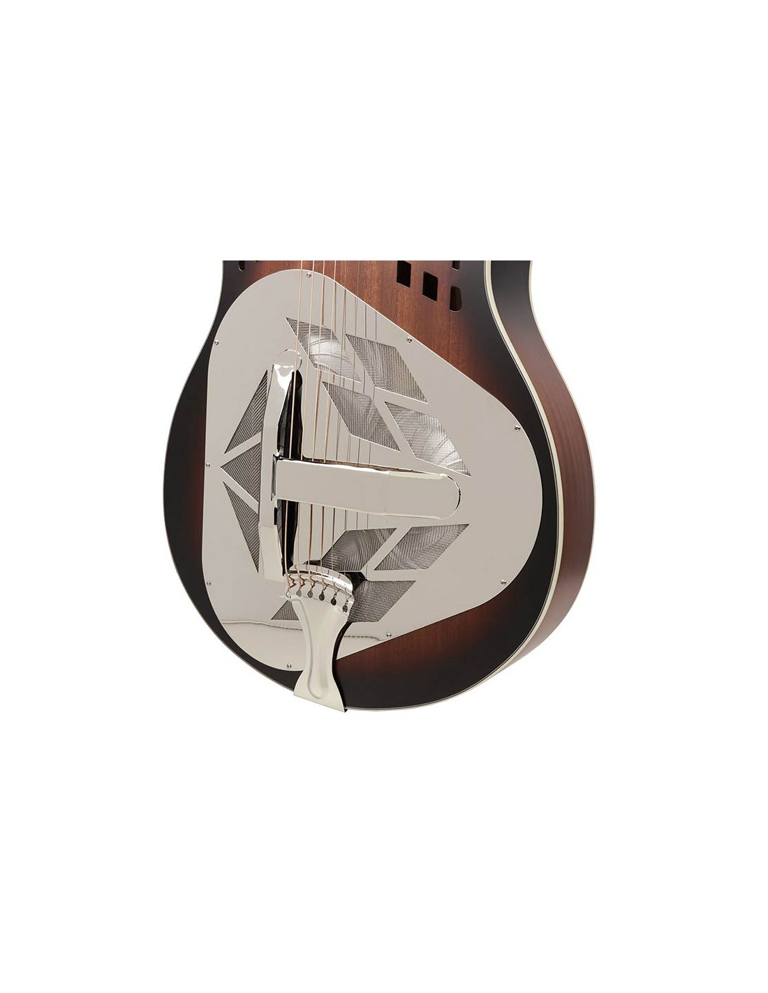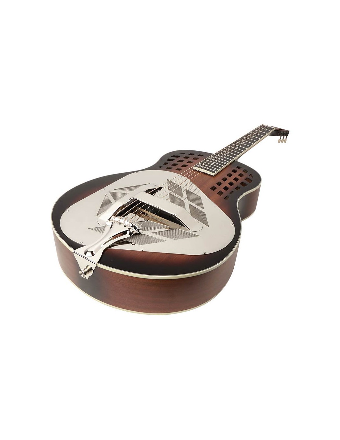 The tricone system in a wooden body gives you the complexity in tone from the three 6 cones which is combined with the earthier tone of the wooden body. The wooden, dark sunburst looks support the darker, woodier tone. Playability is, as always spot on. The luthiers that set up these instruments actually play resonator guitar. In the Royall workshop, the resonators are handspun to suit these instruments. Since this is the heart of the sound, the Royall handspun resonator cones make a huge difference. The best quality available! A lightweight soft case is included.