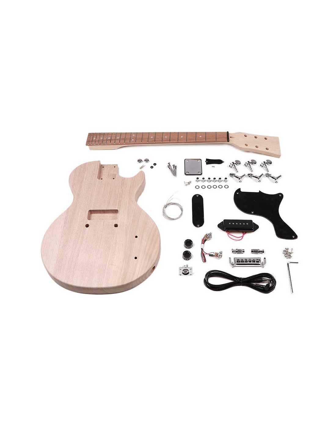 The ultimate rock n roll guitar! This single pickup guitar kit will rock your world, the included single coil P-90 pickup sounds raw and direct, the included wrap-around bridge fits this guitar just perfectly. The approved wood combination adds sustain and bite. The bolt-on neck is simple to install and the limited number of parts make this a nice entry into the world of guitar assembly. The neck is already equipped with frets and neck and the body is already aligned. All parts are included in the package such a pickup, screws, potentiometers, switches, tuners and strings. Furthermore you can of course enjoy them with paint and/or specify the color or gloss you want. If you wish to continue viewing the wood grain, then the clear coat is an excellent choice to emphasize the grain of the wood. The DIY guitar Boston is a fun, easy and creative way to create your own unique guitar.The squared off headstock leaves room for your imagination. Form the headstock to suit your own dreams!