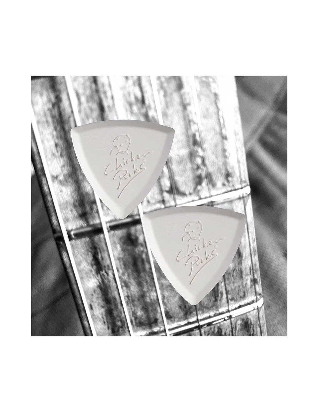 Above all, it is the material that makes a ChickenPicks® unique. This is a high-quality and highly-durable thermosetting plastic. It is an extremely hard substance hard enough to make ChickenPicks® last a long time, even for years of heavy use. But it is smooth, too so smooth that a ChickenPicks® eliminates annoying and unwanted overtones when you play. Finally it is plastic ! The density of the material gives the ChickenPicks® a greater amount of mass. This mass, in combination with a precisely angled edge, makes a ChickenPicks® the perfect tool to improve your sound, and make your playing easier. The precisely angled edge of the ChickenPicks® is essential in creating the right tone and the perfect attack. Years of development have given the makers of ChickenPicks® the expertise needed to ensure that every ChickenPicks® is finished with just the right attack-angle to give you the greatest ease of playing and the strongest, clearest possible tone.!!