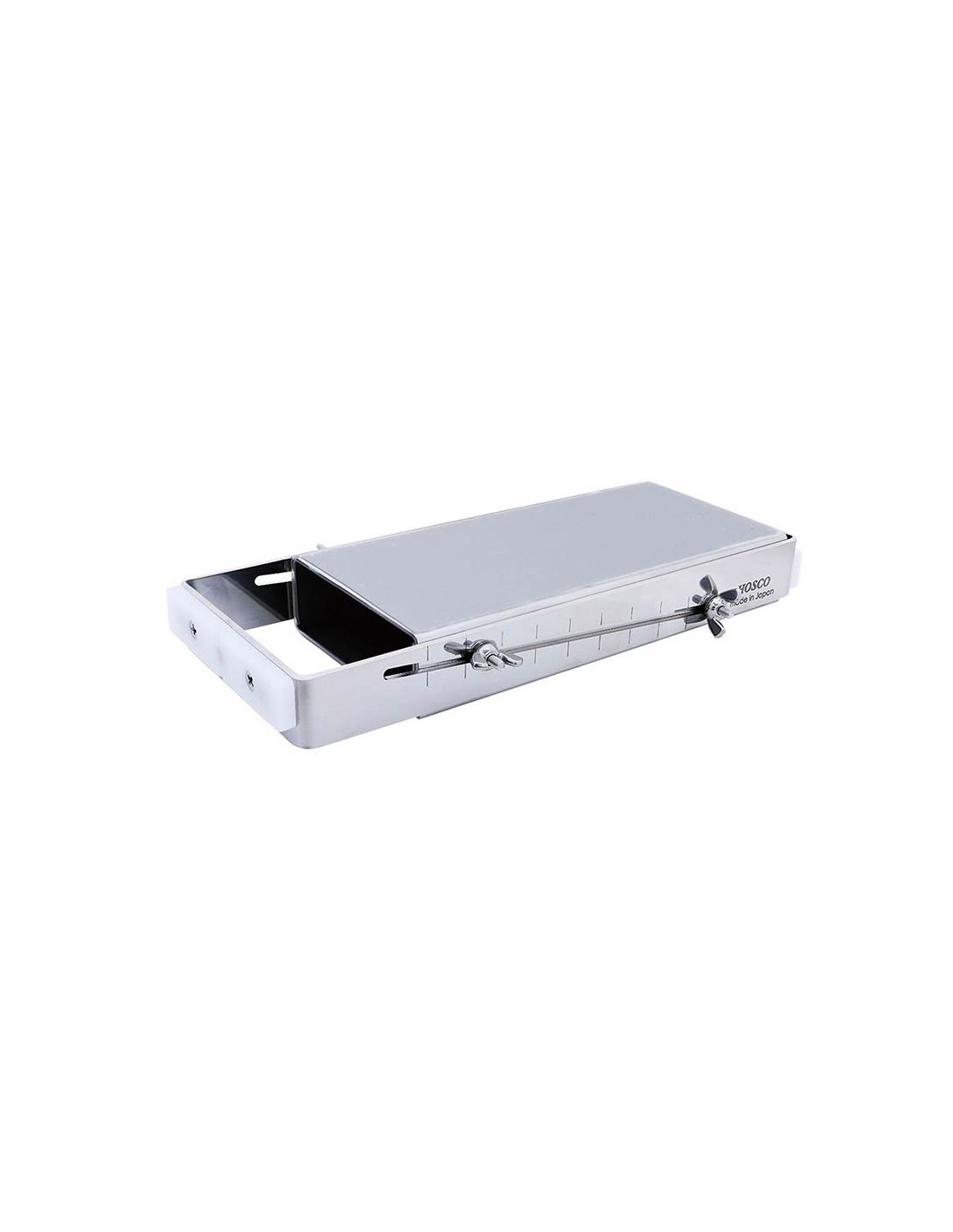 Guide for fretting made in stainless steel, with two silicone rubber bands to prevent slipping. Blocking pieces in both ends made in plastic with three magnets that keep the saw in place. The magnets keep the saw straight and the blocking piece retains the saw back and avoids sawing too deep.