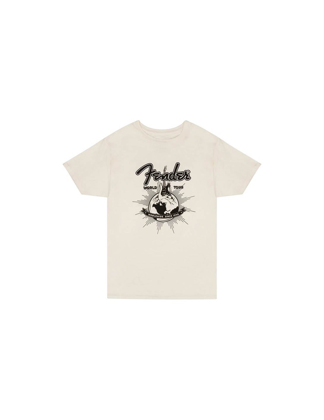 Fender's® world tour is about to begin with this throwback tour t-shirt. In vintage white, with iconic Fender® release dates on the back you will feel part of our rich legacy. Starting in 1947 with the release date of our famous Princeton® classic tweed amplifier and ending the tour in 1966 with the release date of our celebrated 1964 Mustang® bass guitar. What a journey it has been!
