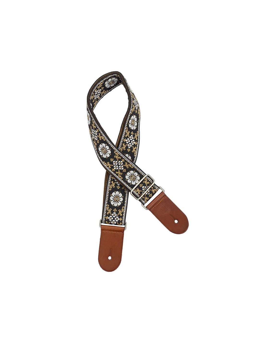 guitar strap, 2 jacquard weave, brown leather slips, brown garment leather backing, white/black