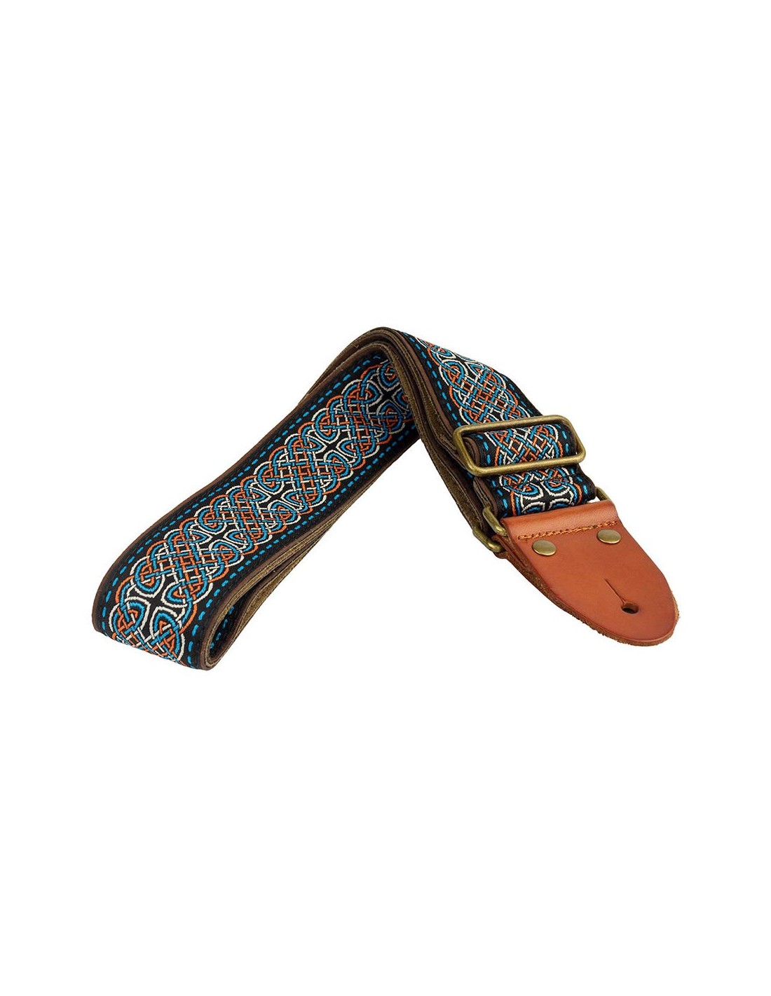guitar strap, 2" jacquard weave, leather slips with pins, brass buckle, suede backing, bk/bu