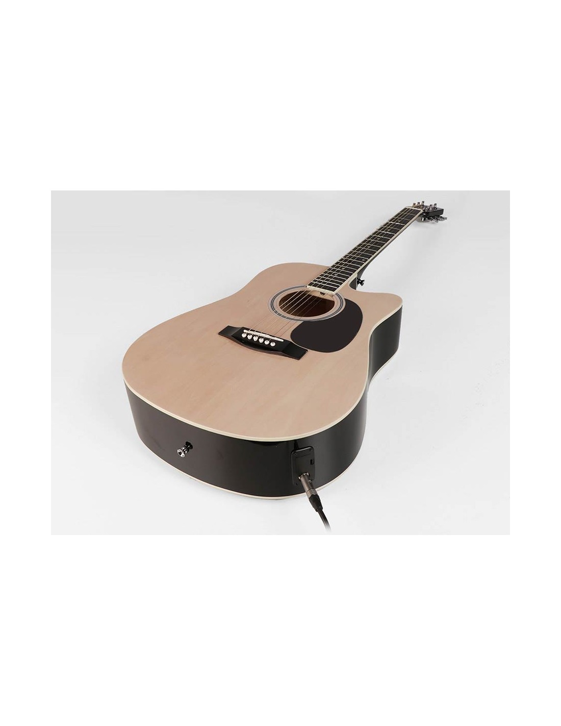 dreadnought guitar, S. American roupana fb & bridge, diecast machine heads, cutaway, active EQ, nat