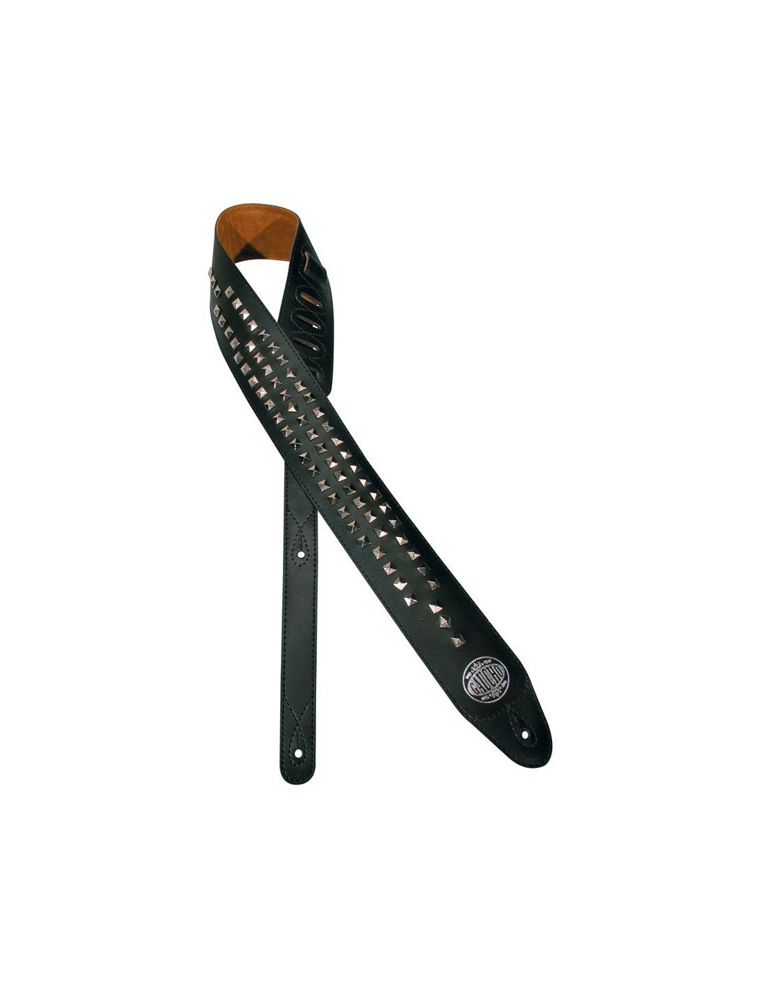 guitar strap, black, with chrome pyramids