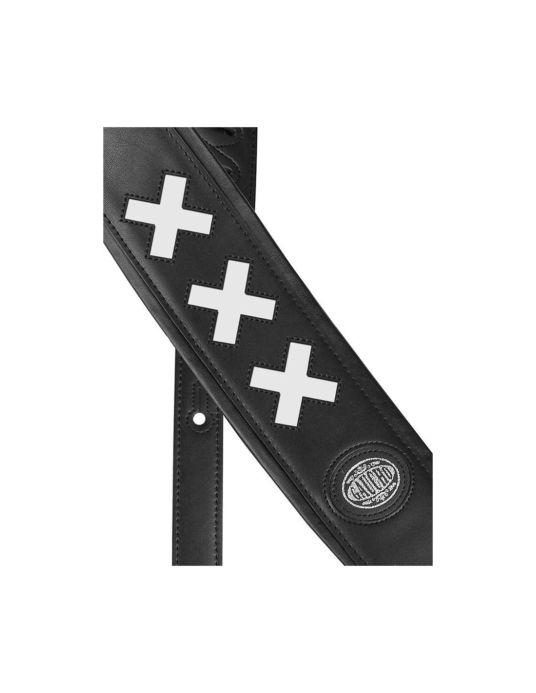 guitar strap, black padded back, black leather with white crosses