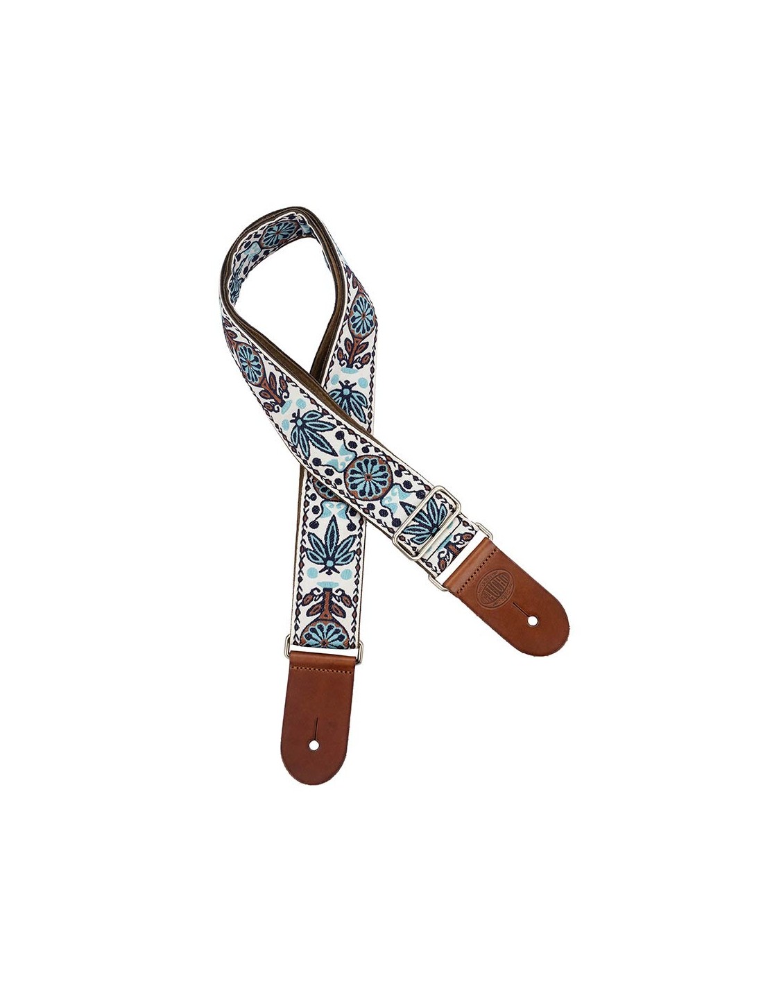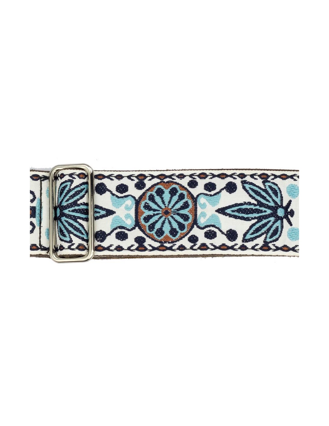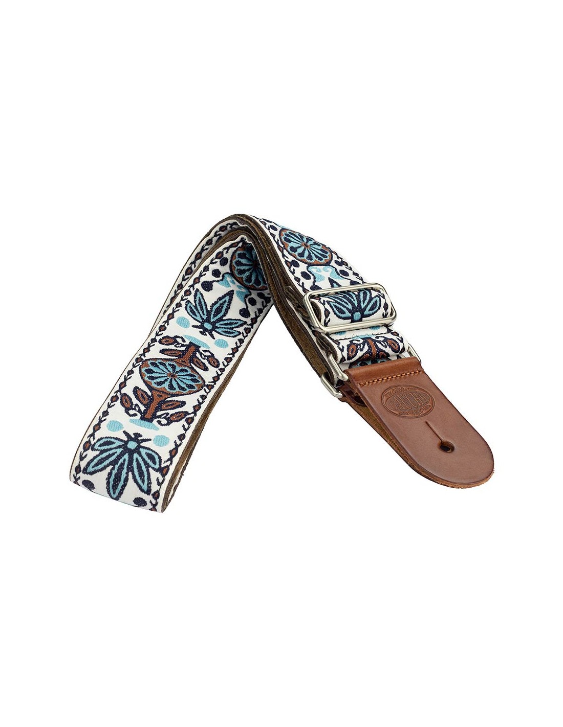 guitar strap, 2 jacquard weave, brown leather slips, brown garment leather backing, white/blue