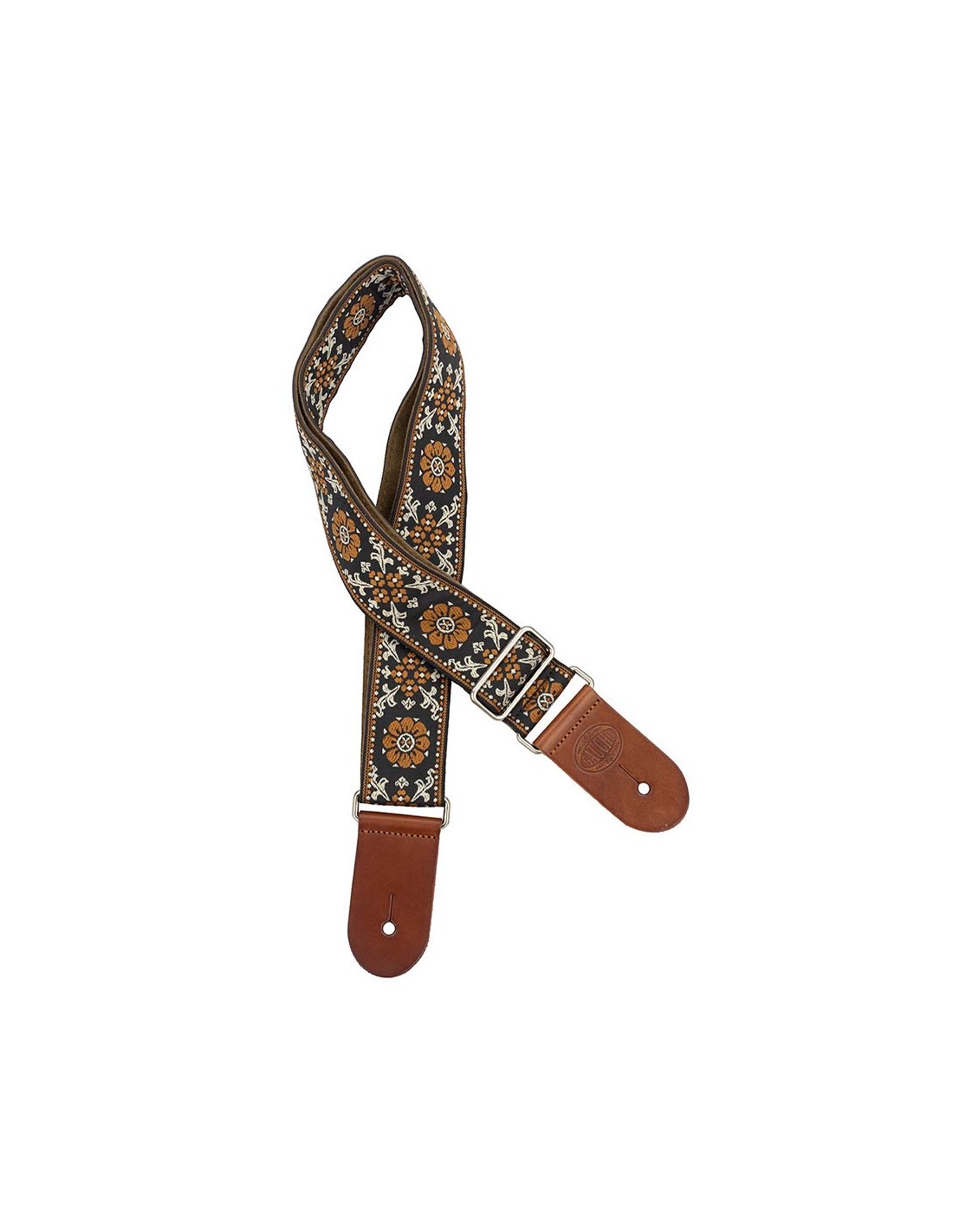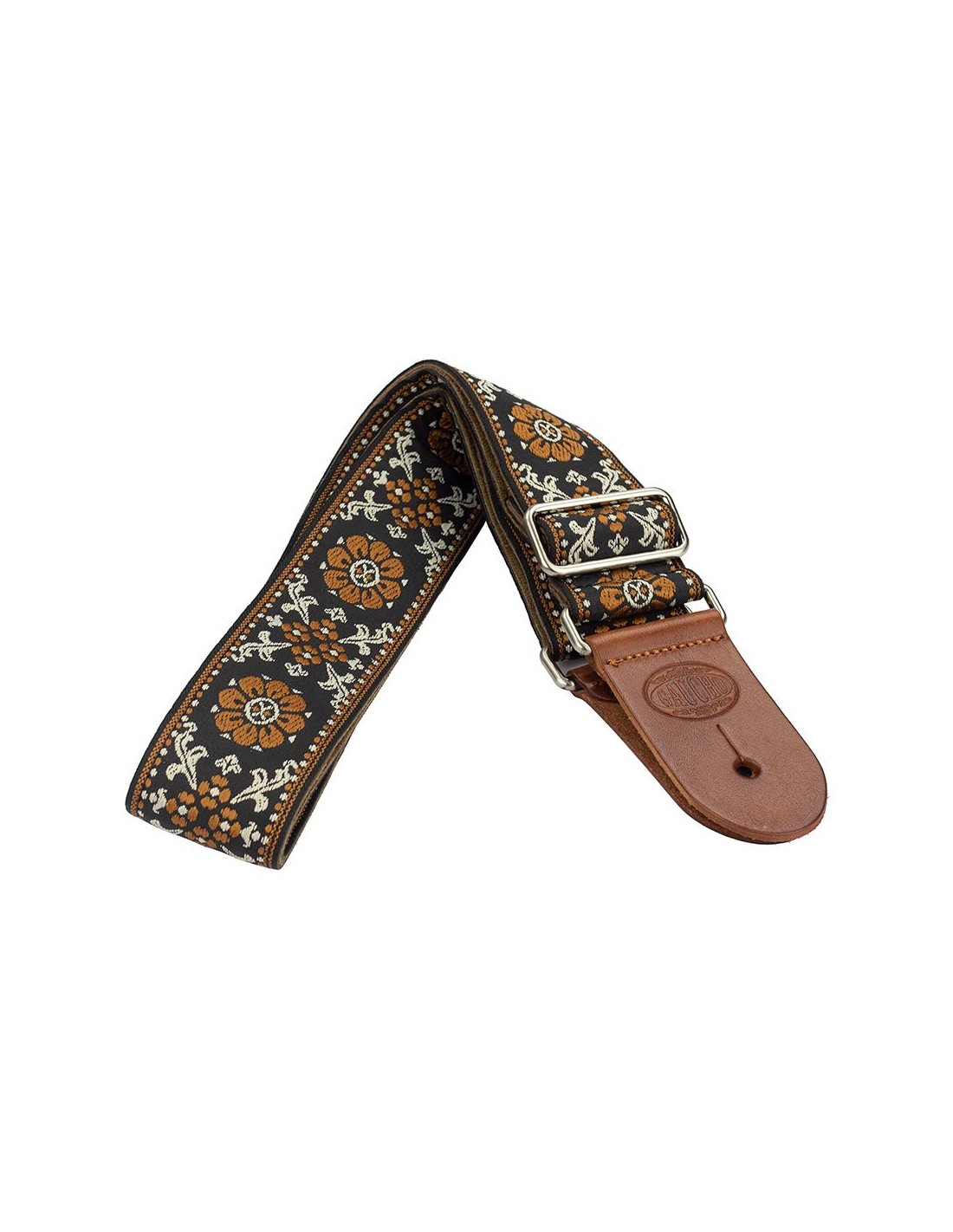 guitar strap, 2 jacquard weave, brown leather slips, brown garment leather backing, brown/gold