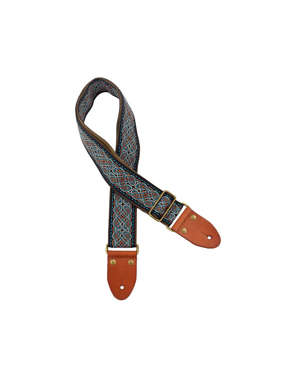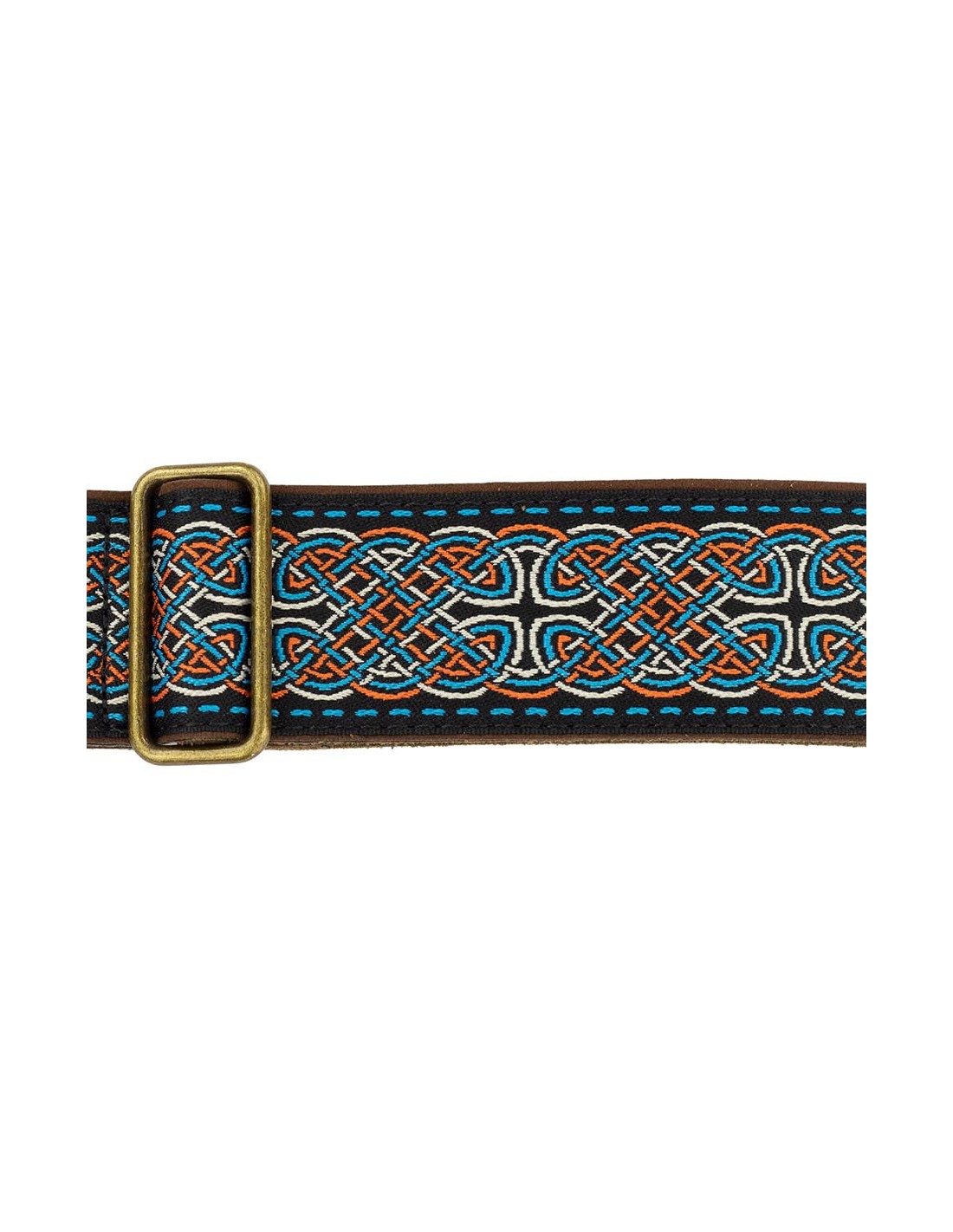 guitar strap, 2" jacquard weave, leather slips with pins, brass buckle, suede backing, bk/bu