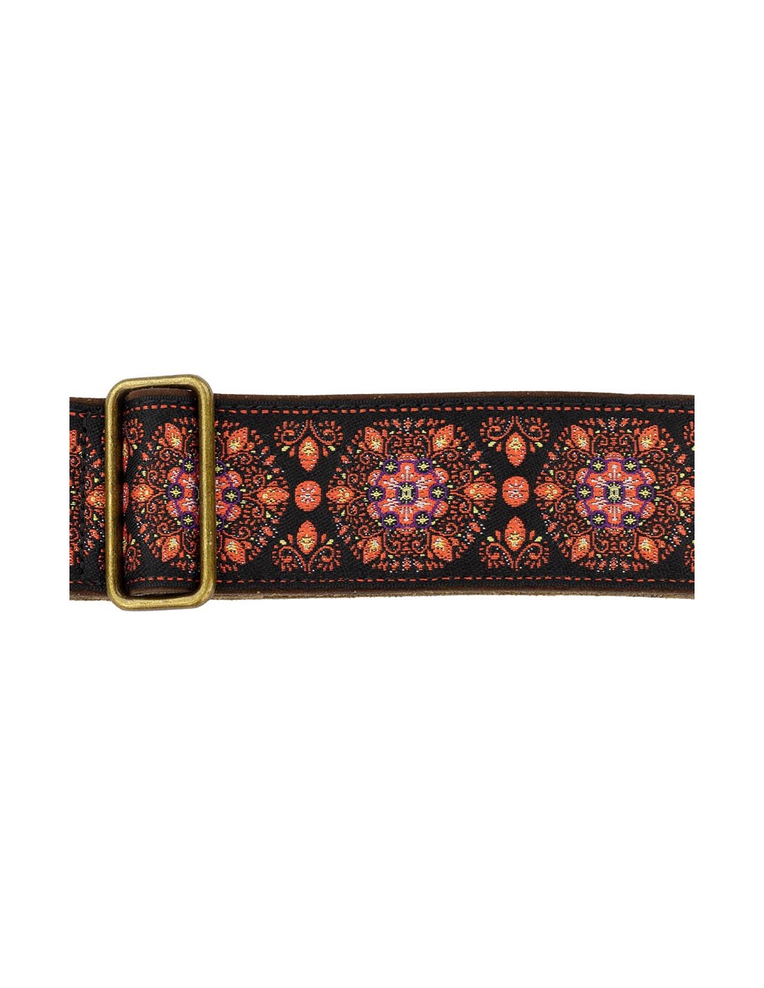 guitar strap, 2" jacquard weave, leather slips with pins, brass buckle, suede backing, bl/pk