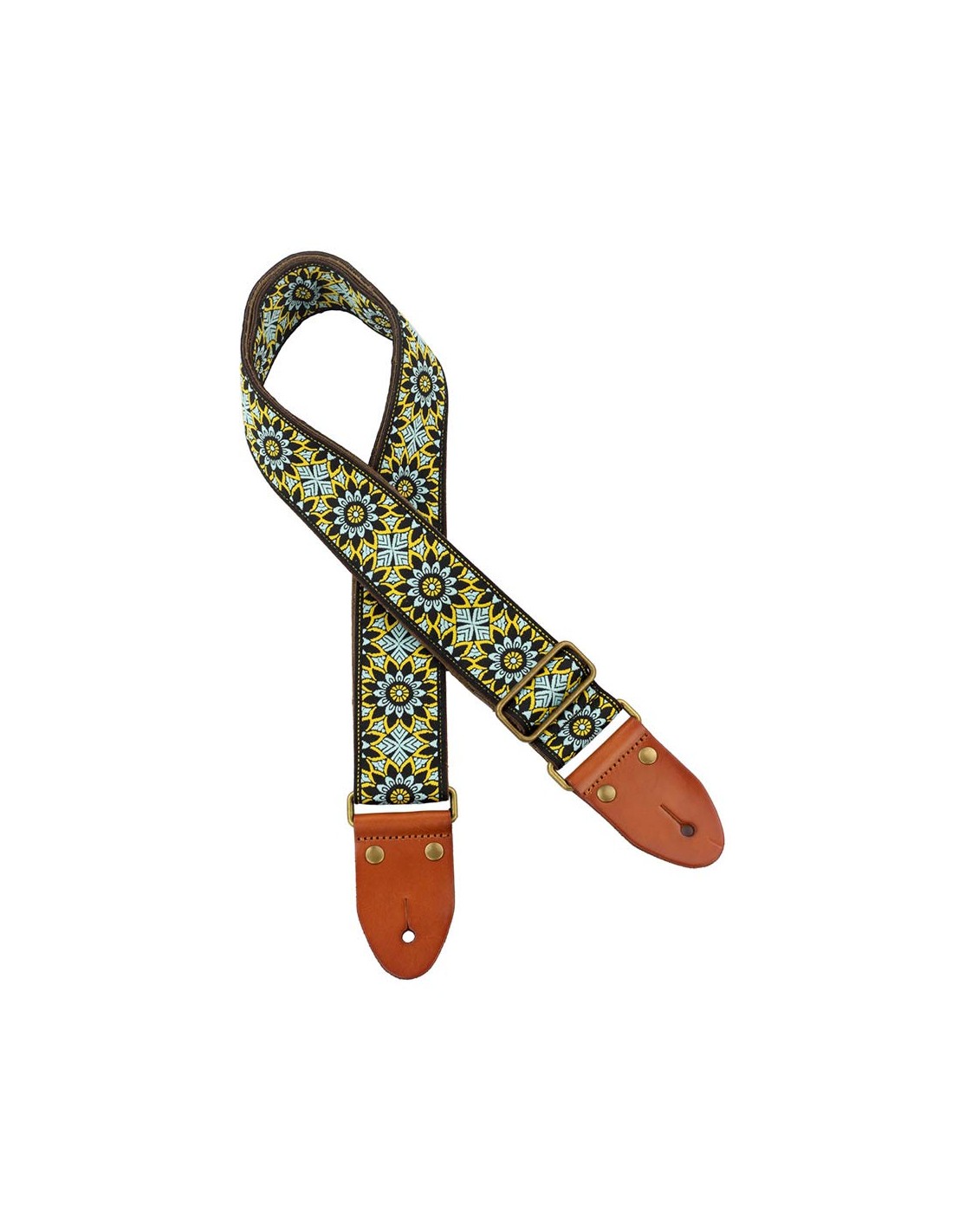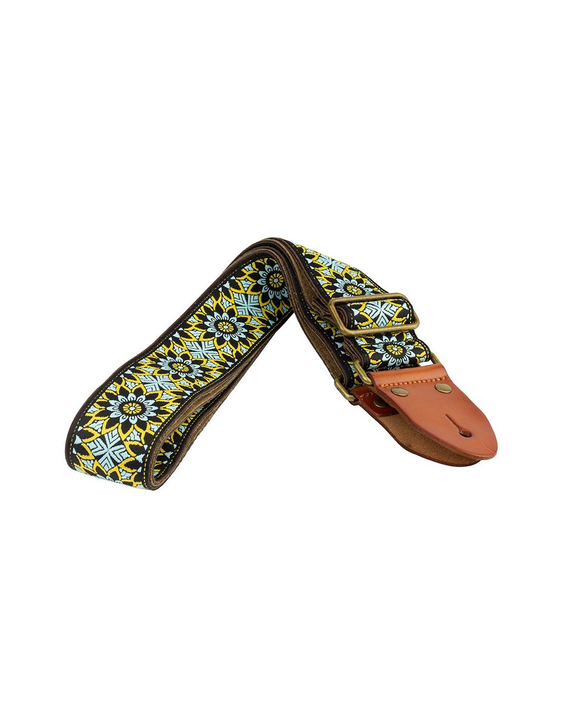guitar strap, 2" jacquard weave, leather slips with pins, brass buckle, suede backing, bk/bu/gn