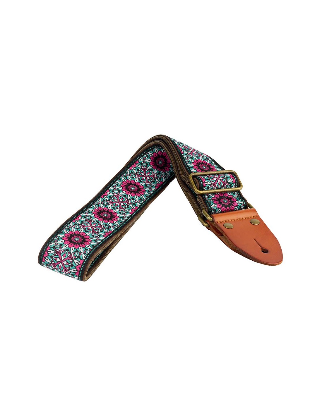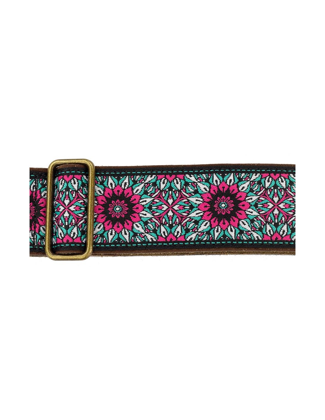 guitar strap, 2" jacquard weave, leather slips with pins, brass buckle, suede backing, bk/bu/pk