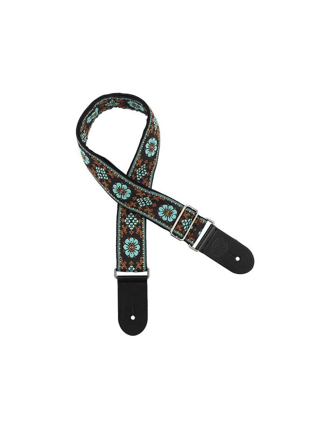 guitar strap, 2” jacquard weave, leather slips, multi colors