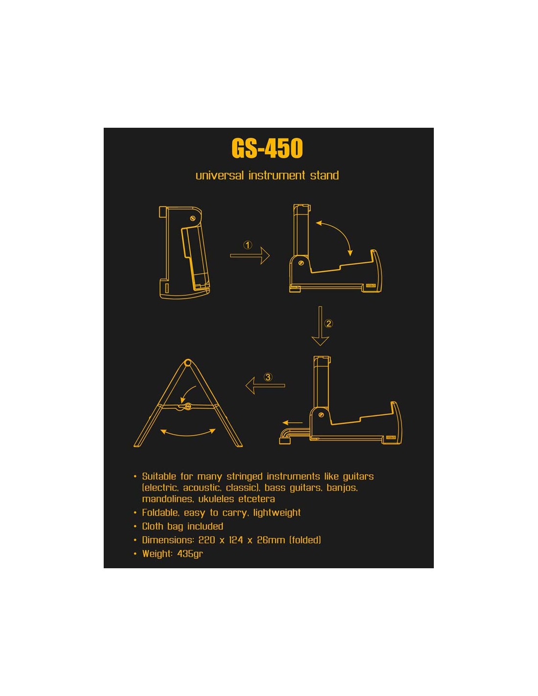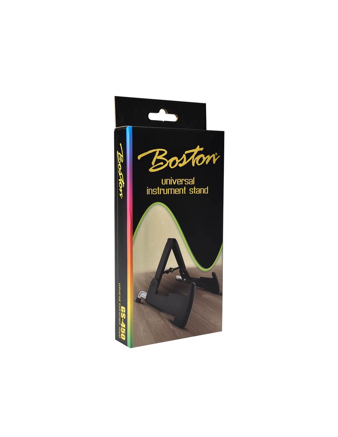 The Boston GS-450 is a small but stable and foldable instrument stand. You can use it for guitars (acoustic and electric), bassguitar, mandolin, bouzouki, ukulele and more.