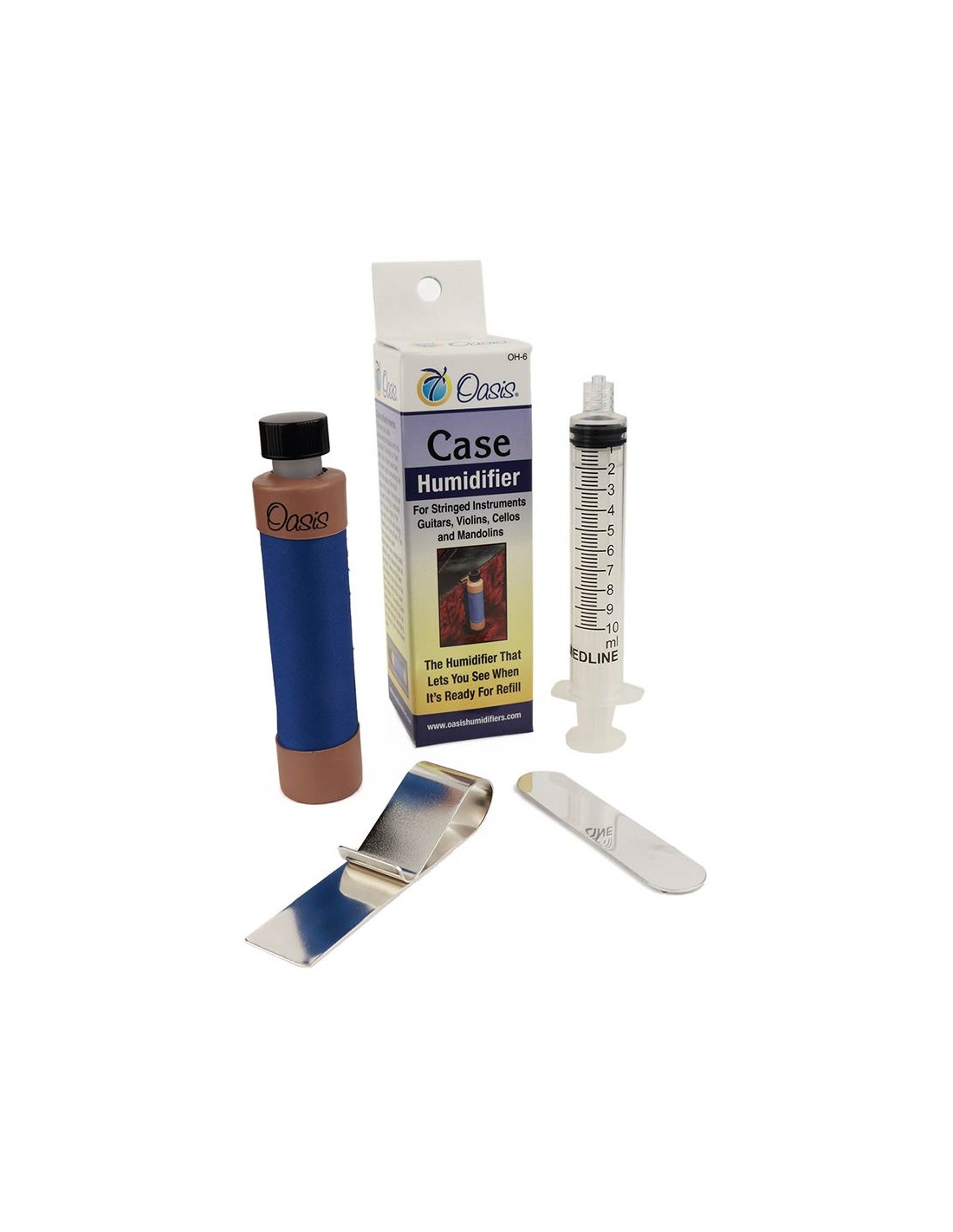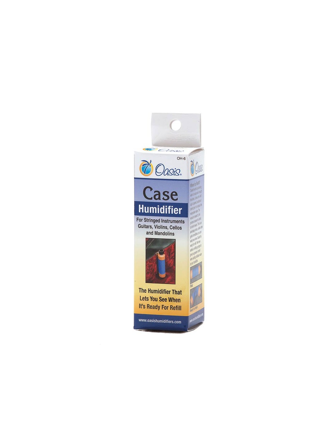 The huge success of our original blue Oasis® "sound-hole" Guitar Humidifier brought numerous inquiries about how to provide humidification for other wooden instruments such as violins, violas, cellos, mandolins, jazz guitars, guitars with flat top cases, and some woodwind instruments like clarinets. After careful consideration and research, we developed our Oasis® Case Humidifier.