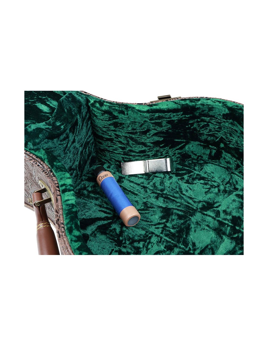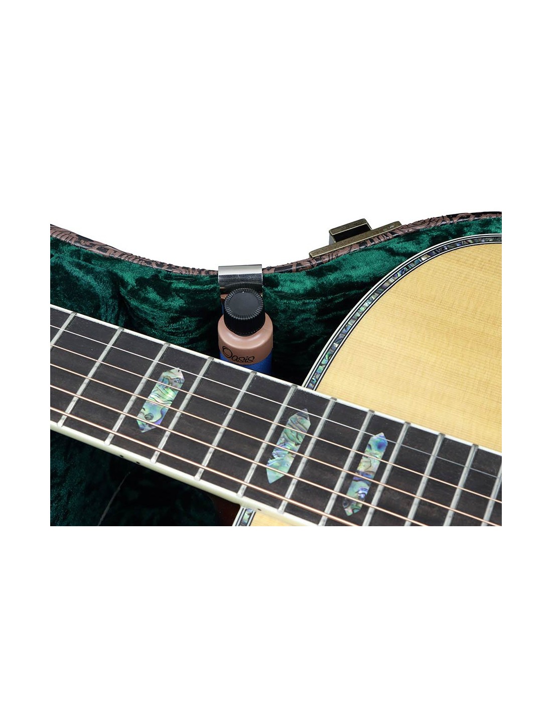 Oasis case humidifier in useHow does it work? A neodymium magnet* in the humidifier enables you securely attach it inside your case, while still being able to easily remove and re-attach it to either a steel belt-style clip or a stainless steel strip with adhesive backing (both are provided with the humidifier). The belt-style clip fits over the side of your case, providing a flat vertical surface to which the magnet can adhere. The adhesive-backed stainless steel strip allows for either vertical or horizontal attachment anywhere there is a flat surface inside the case.** This type of humidifier provides the flexibility to position the humidifier in a wide variety of locations within your instrument case.