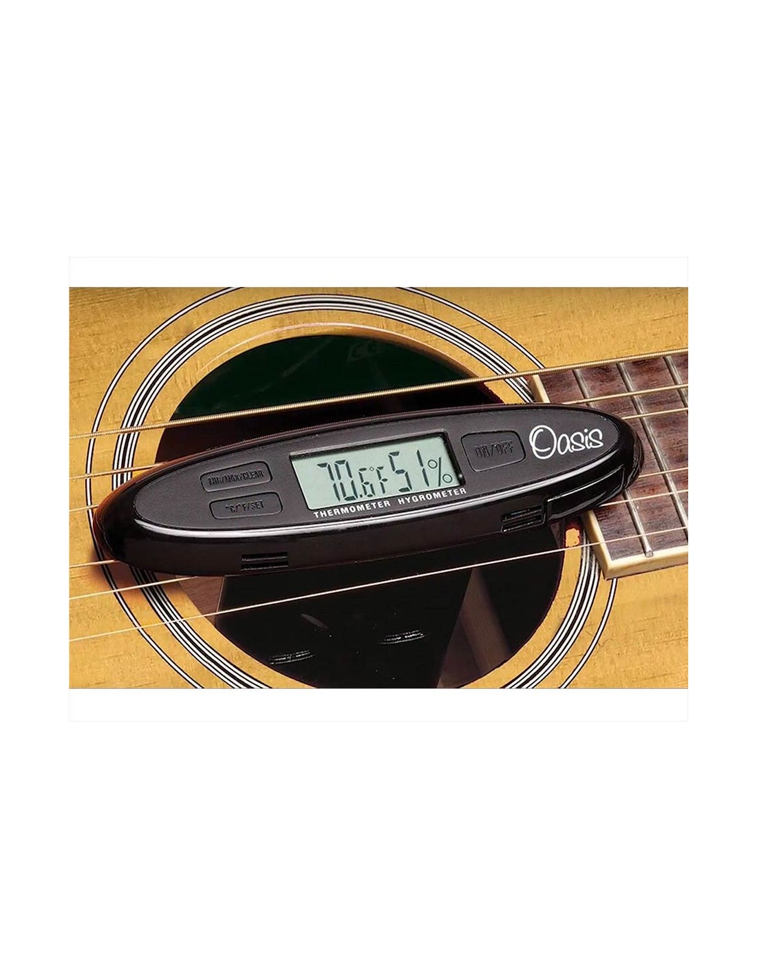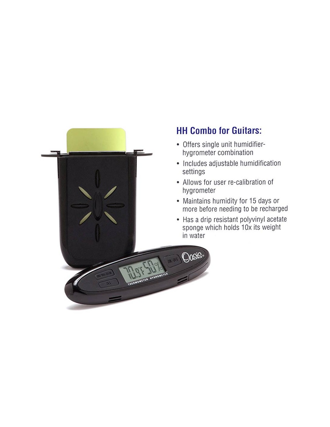 The Oasis HH Combo is the only humidifier/hygrometer designed to fit in the soundhole of a steel string acoustic guitar. When using a humidifier to boost the humidity inside a musical instrument it is important to monitor humidity levels. Otherwise, maintaining correct humidity is just guesswork. The HH Combo has two parts. Above the strings, the upper portion of the unit contains a clearly visible and accurate hygrometer, which can be calibrated by the user if necessary. The humidifier clips securely into the bottom of the hygrometer. Suspended by the strings, the humidifier releases moisture evenly and slowly inside the guitar yet never touches the instrument body. A specialized, drip resistant, sponge holds 10 times its dry weight in water, which allows for a longer periods between refills. There are four openings on each side of the humidifier for the water vapor to escape. This is sufficient for most dry areas. In dryer climates like Arizona, there are 4 additional openings which can be punched out to provide more humidity. The sponge is easily recharged by moistening the sponge with distilled water. Using the HH Combo during dry months will protect your instrument safe from cracks and warping.