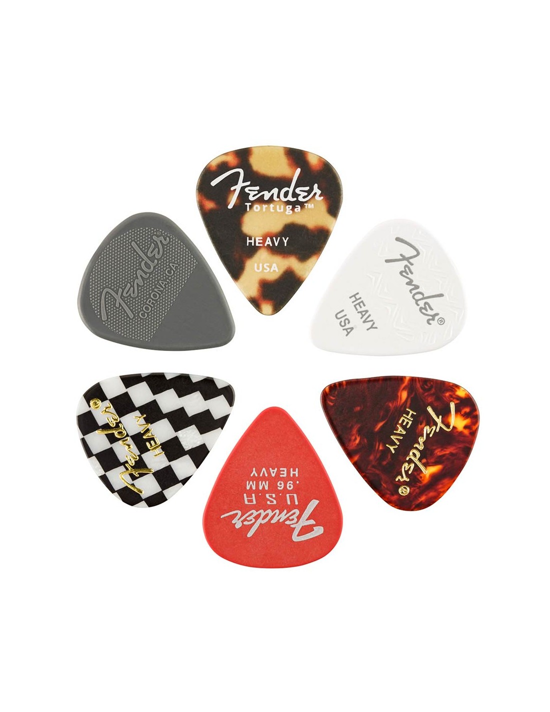 The traditional 351 shape, our most popular pick design, is a perfect accessory for players of versatile styles and techniques. This six-pack of picks contains one crafted from various Fender materials: Celluloid, Tortuga, Nylon and Dura-Tone™, along with a Wavelength™ pick.