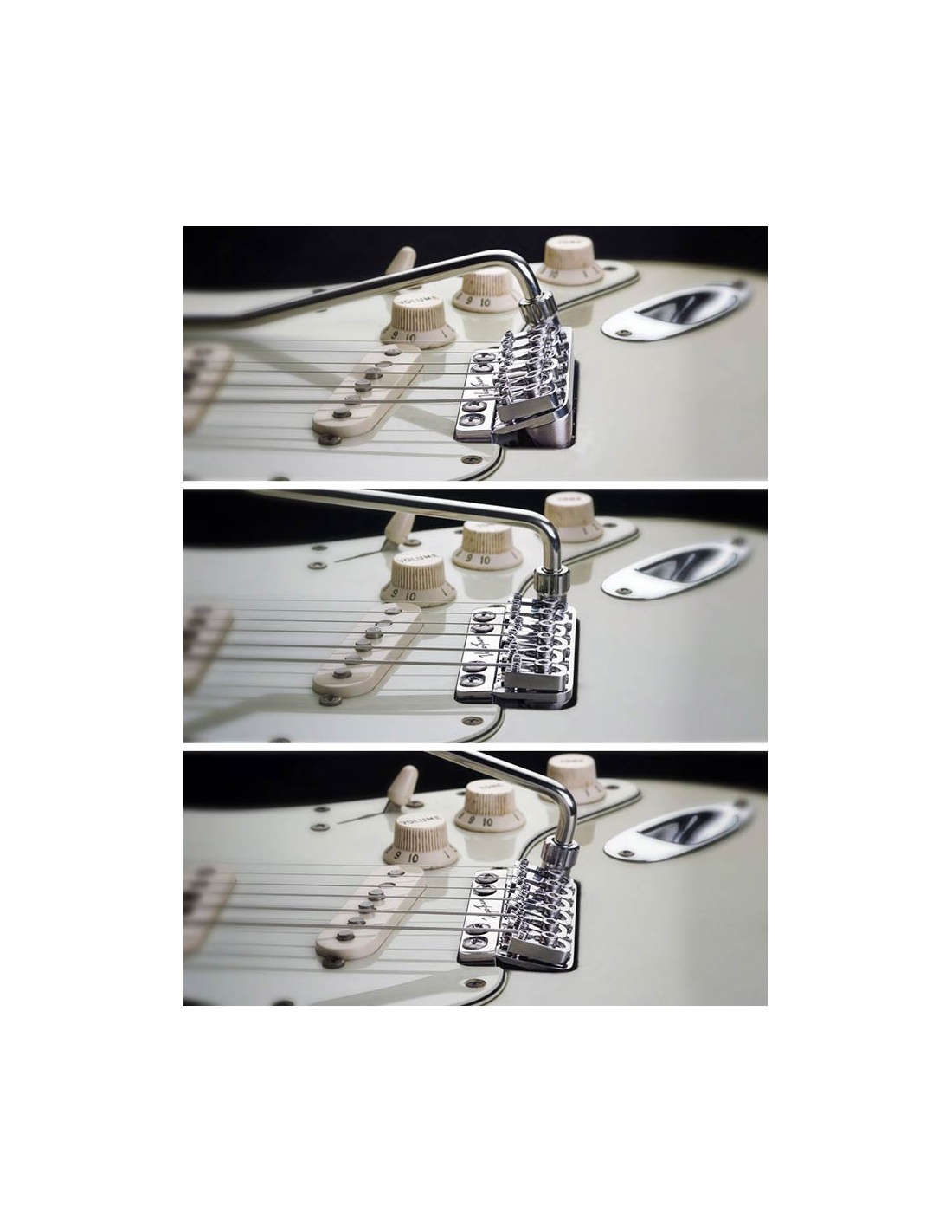 The patented VT system (ES 1119430 U) is based on two basic principles: the adaptation of the bridge dimensions to the existing standard cavity in the ST models and the bridge pivoting system. Adapting the dimensions aims to allow the bridge to freely enter into the cavity of the guitar body by pulling the whammy bar back (tensioning the strings) and requires a redesign of the complete assembly (saddles, plate and block). To optimize the movement of the bridge, the pivotal center of action has been changed by adding a part (fulcrum) that replaced the traditional concept of support on screws, giving more amplitude to that movement. The shape of the point of support of the plate on the fulcrum has also been changed, minimizing friction, which is practically non-existent. The result is a homogeneous action very pleasing to the musical performance totally free of unwanted noises. (It is recommended to use low friction nuts and locking tuners).