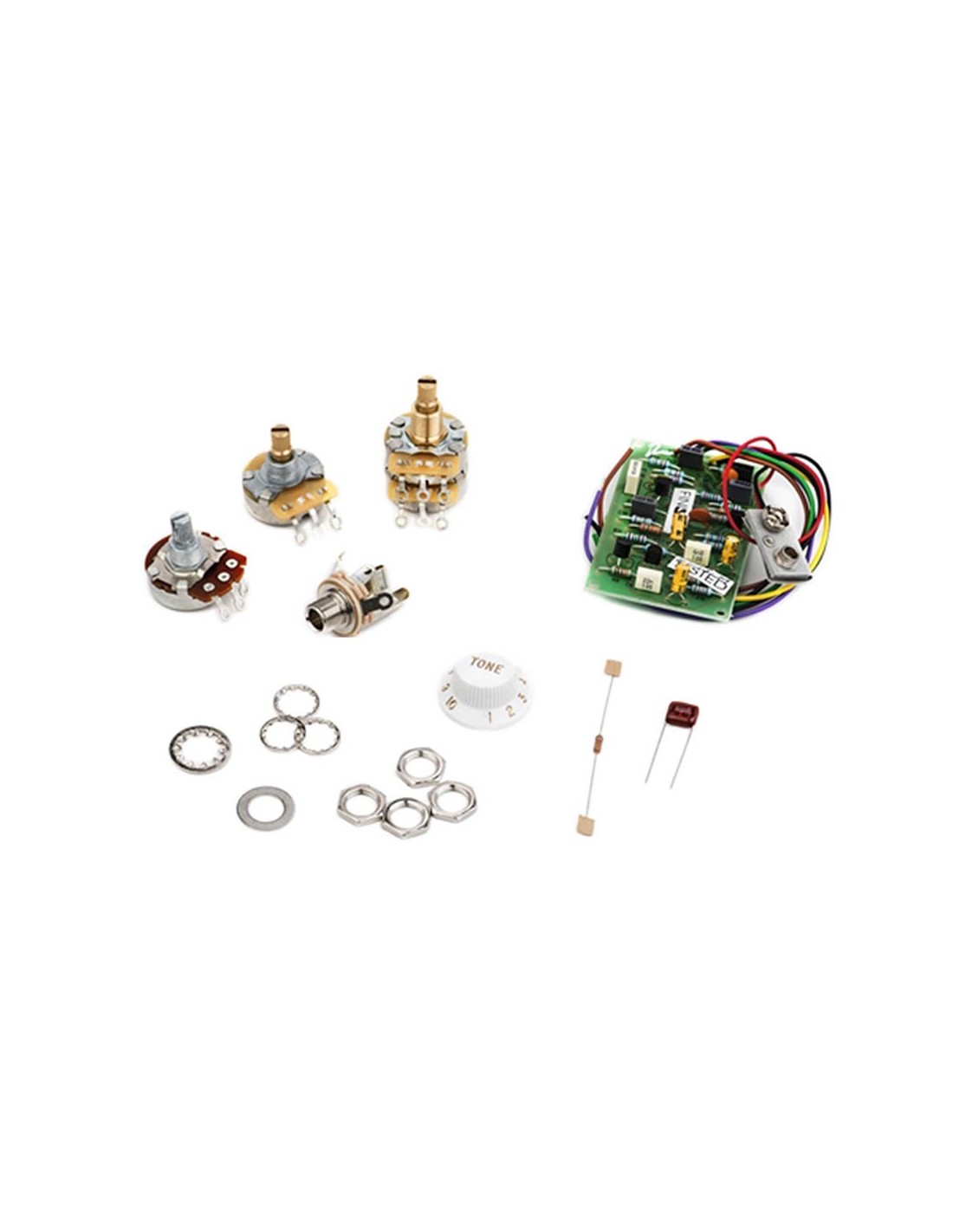 Kit includes primary PCB board, TBX tone potentiometer, volume and tone potentiometers, output jack, capacitor and 1/4-watt resistor, mounting hardware, wiring diagram and setup instructions.