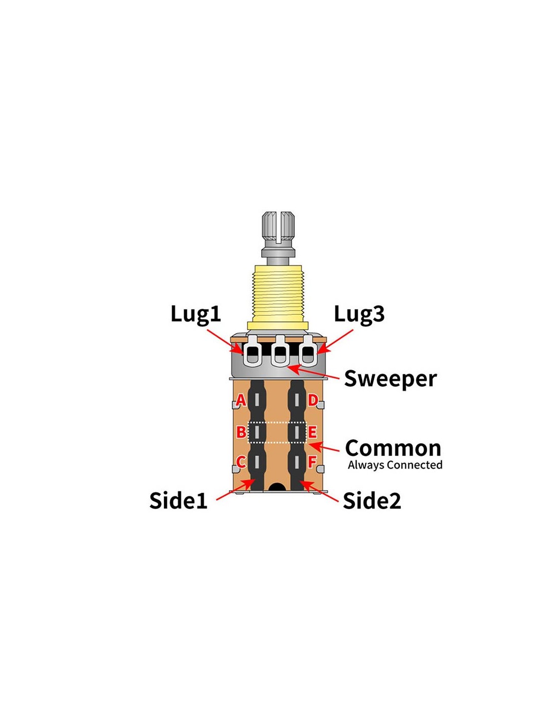 As four variations (250K A type, 250K B type, 500K A type and 500K B type) are available, you can connect and wire any pickups.
