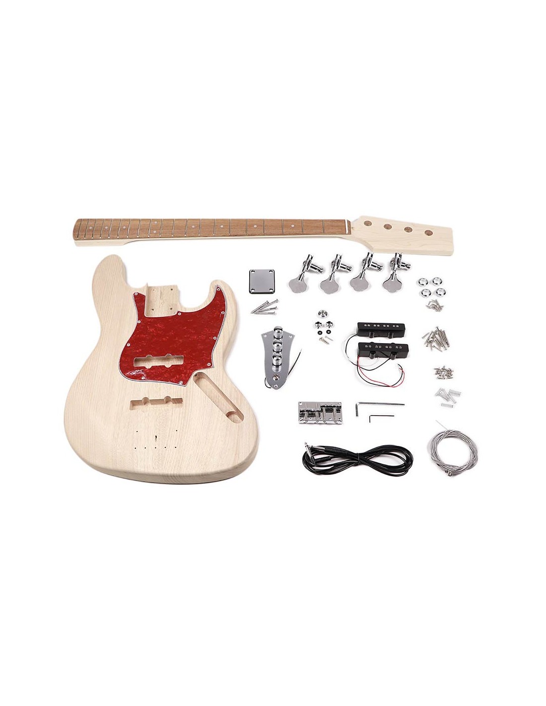The neck is already equipped with frets and neck and the body is already aligned. All parts are included in the package such as pickups, screws, potentiometers, switches, tuners and strings. Furthermore you can of course design this bass guitar and paint in the color or gloss you want. If you wish to show the wood grain, then the clear coat is an excellent choice to emphasize the grain of the wood. The DIY guitar Boston is a fun, easy and creative way to create your own unique guitar.