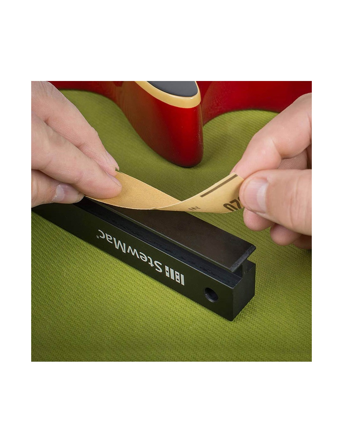 Now, you can level your frets...with the strings ON! Matt Brewster from 30th Street Guitars brought us this amazingly simple (but effective) idea for getting perfect fret dresses with the strings still on the guitar. This great idea became the StewMac Fretbar® understring leveler. This revolutionary new tool lets you level your frets under full tension without removing the strings. It's designed to work with 2,5 cm wide 3M Stikit Gold abrasives for ultra-fast set up and leveling.