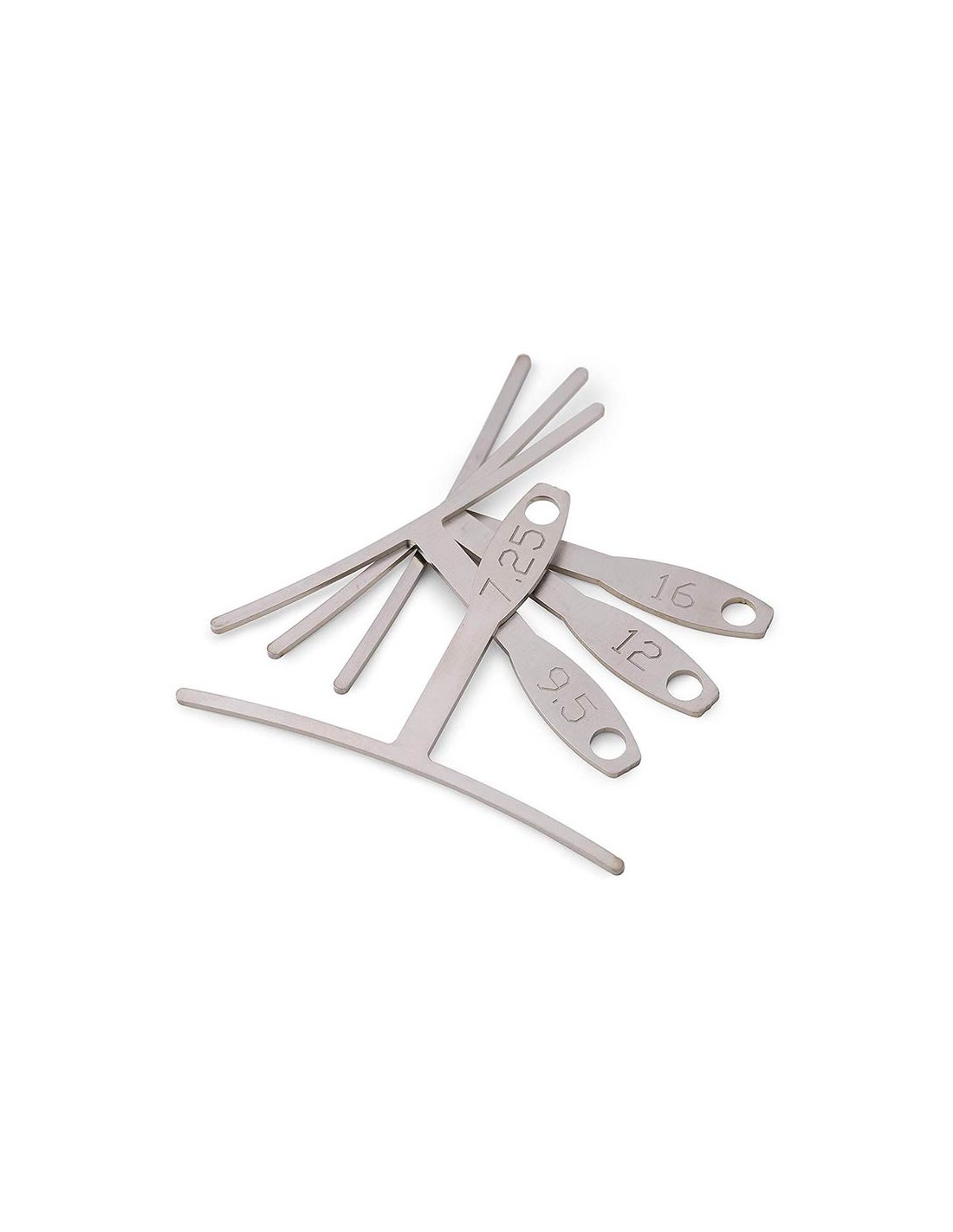 Fast, accurate bridge saddle adjustment! Each of these unique gauges has an accurately radiused arc on both the top and bottom surfaces, and is shaped to fit easily under the strings. Use the bottom curvature to determine your fretboard radius, and the matching top curvature becomes a reference for setting string saddle heights for best playability.