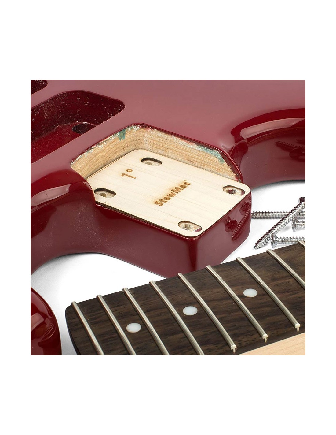 There are 3 different degrees available for changing the pitch of a bolt-on neck. The 0.25-degree shim offers the most versatility. Stacking them will let you really dial in the neck angle you're after. The 0.5-degree shim is the one you'll reach for most often. It works great on Fender™ and many other solid body guitars.
