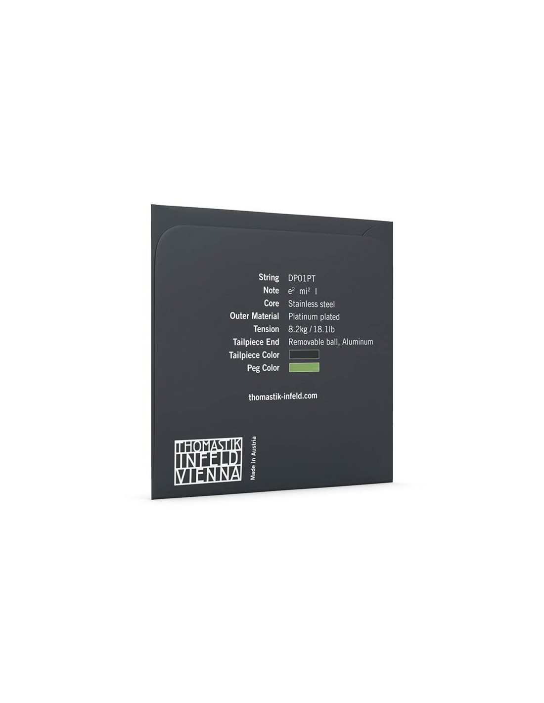 Of all the E-strings described, THDP-01PT [diameter 0.268 mm, 8.2 kg, removable ball end] has the greatest projection capacity. It combines the clarity of the gold-plated THDP-01AU with the response of the tin-plated THDP-01. Like THDP-01AU, THDP-01PT is also extremely corrosion-resistant, but has less of a tendency to whistle and offers more brilliance in comparison. Due to its outstanding projection capability and clarity, it can be unsuitable for sensitive ears.