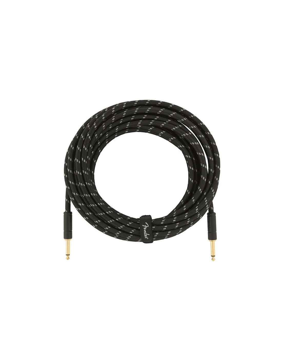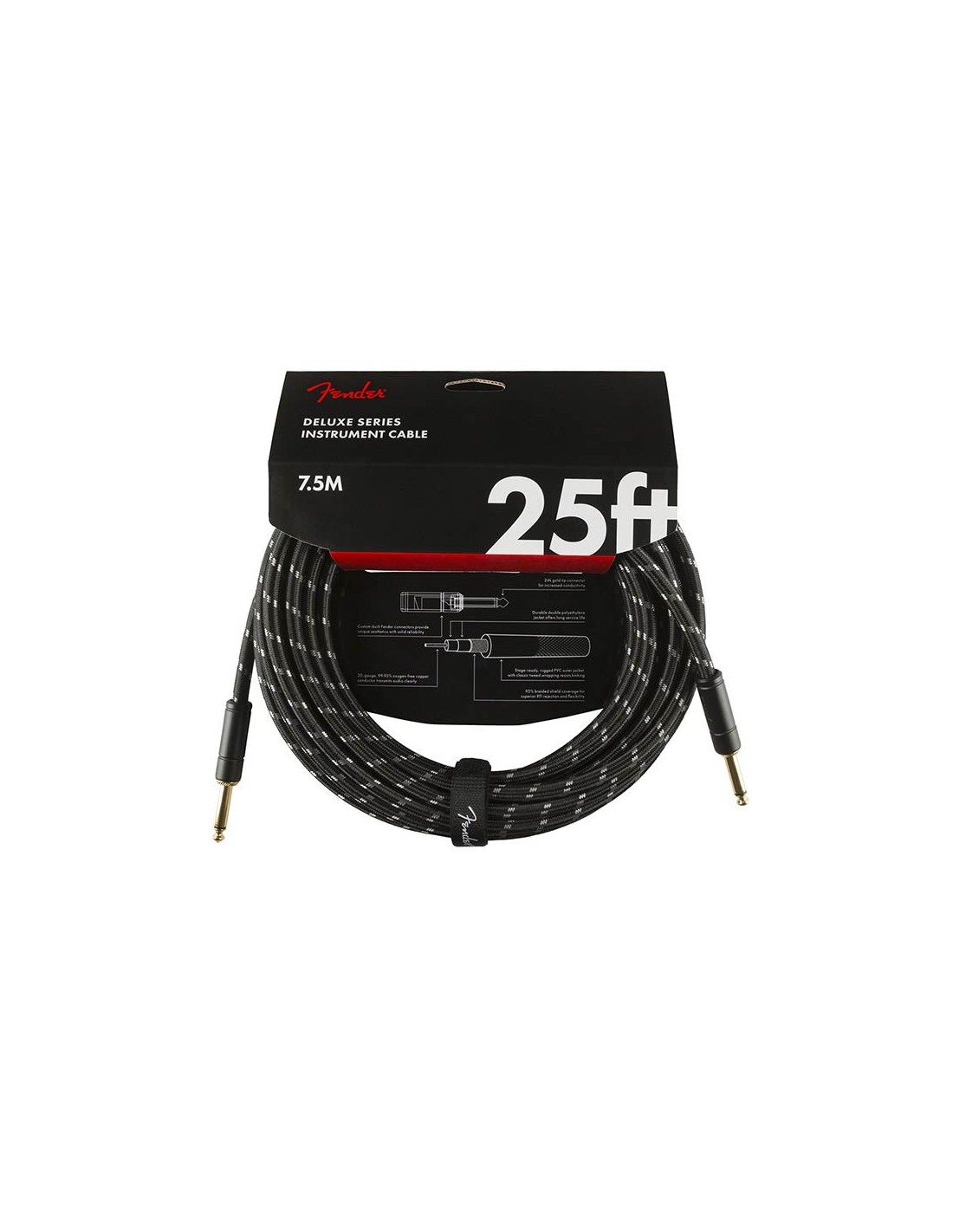Fender Deluxe Series cables carry the highest quality materials and braided shielding to deliver flagship durability, conductance and transparency. Our top-of-the-line cables sport custom molded ends with strain relief under the housing—plus 24K gold-plated connectors that won’t tarnish or degrade your sound over time. These cables use a very quiet braided shielding that is engineered to maximize the purity of your tone, and they’re protected by a soft-woven yet rugged tweed jacket that provides ultimate protection with classic Fender style.