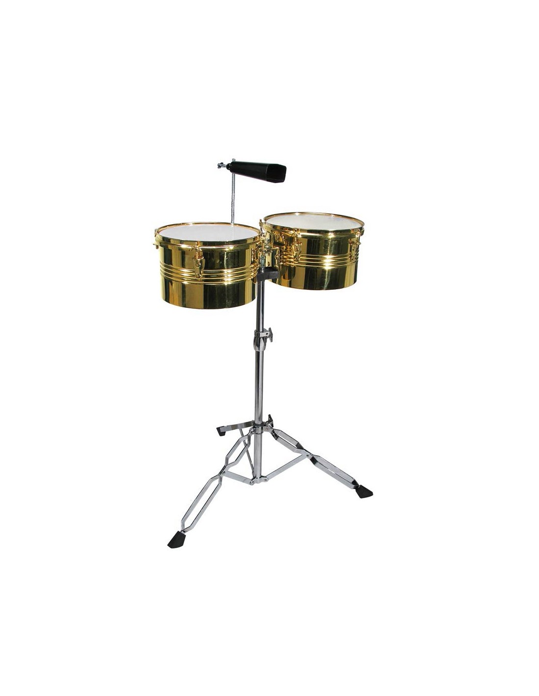 timbales, steel, brass finish, with double stand and cowbell, 13"+ 14"