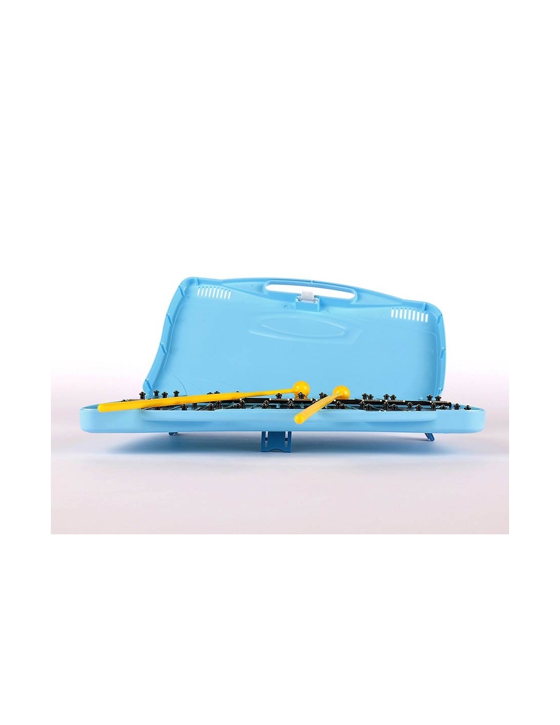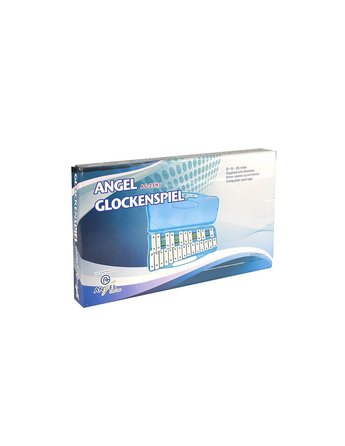 The Angel AX-25N2 is a good quality Glockenspiel, preassembled in a mint blue plastic case. It has 25 nickel bars which cover 2 octaves from G2 to G4.