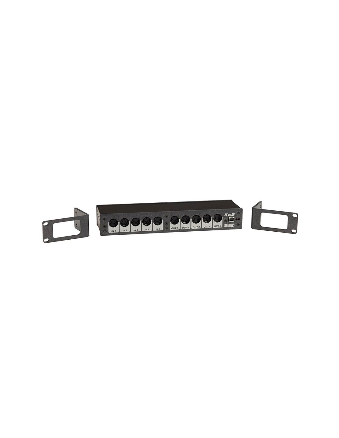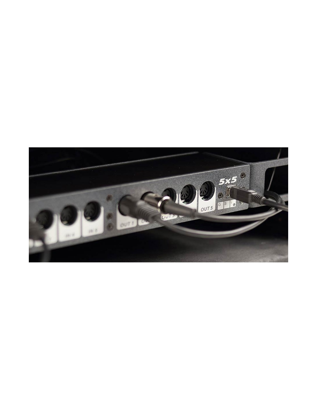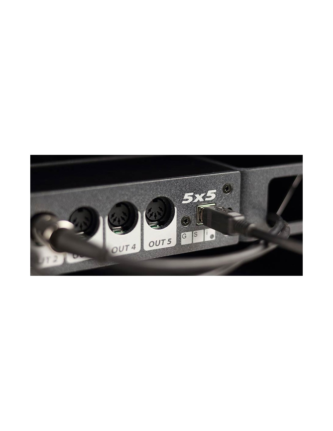 The GSi 5x5 is a professional rackmount 5-input / 5-output USB-Midi interface, ideal for the studio but great for complex live setups as well. It's built into a sturdy metal case with included rack ears that can be mounted in two ways. In front mode, all connections are on the front. The large eyelets in the rack ears allow the cables coming from the back of the rack cabinet to reach the front of the device in an ordered fashion. In rear mode, all connections stay on the rear.