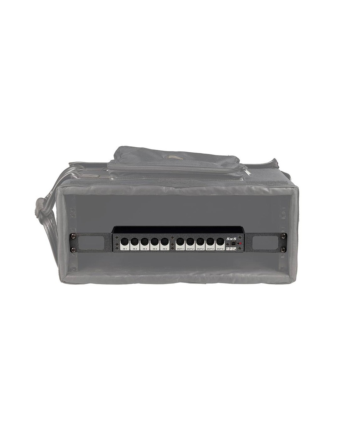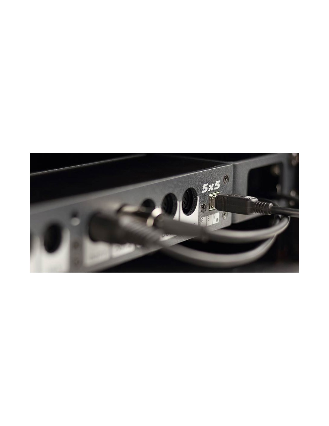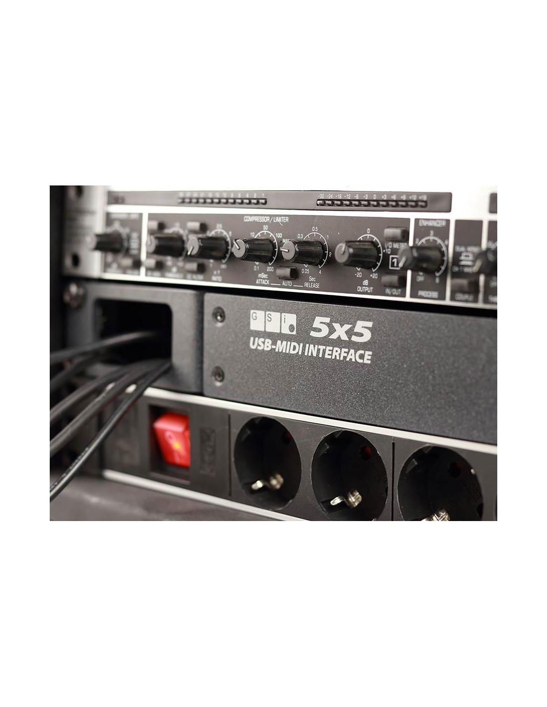 The GSi 5x5 is a professional rackmount 5-input / 5-output USB-Midi interface, ideal for the studio but great for complex live setups as well. It's built into a sturdy metal case with included rack ears that can be mounted in two ways. In front mode, all connections are on the front. The large eyelets in the rack ears allow the cables coming from the back of the rack cabinet to reach the front of the device in an ordered fashion. In rear mode, all connections stay on the rear.
