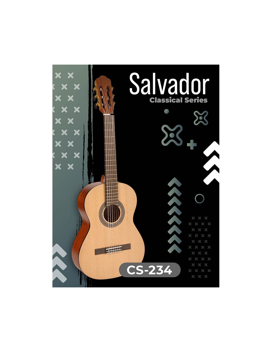 The Salvador CS-234 is a great entry-level classical guitar with a high-quality (satin) finish and excellent playability. It has nickel frets, an adjustable truss rod and is made of durable spruce with sapele back and sides. All these features result in a great sounding guitar with a friendly price.